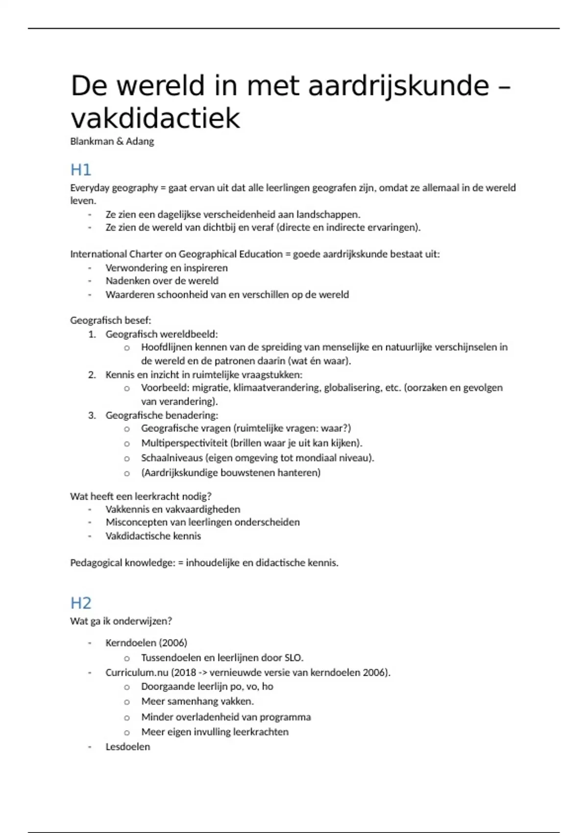 In dit document is H1 t/m H3 van De wereld in met aardrijkskunde - vakdidactiek samengevat in een overzichtelijk en duidelijk document.
