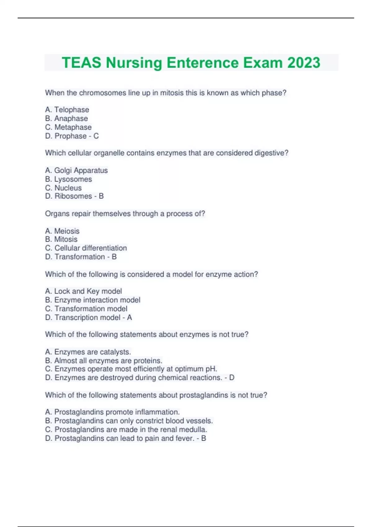 When the chromosomes line up in mitosis this is known as which phase? A. Telophase B. Anaphase C. Metaphase D. Prophase - C Which cellular organelle contains enzymes that are considered digestive? A. Golgi Apparatus B. Lysosomes C. Nucleus D. Ribosomes - B Organs repair themselves through a process of? A. Meiosis B. Mitosis C. Cellular differentiation D. Transformation - B Which of the following is considered a model for enzyme action? A. Lock and Key model B. Enzyme interaction model C. Transformation model D. Transcription model - A Which of the following statements about enzymes is not true? A. Enzymes are catalysts. B. Almost all enzymes are proteins. C. Enzymes operate most efficiently at optimum pH. D. Enzymes are destroyed during chemical reactions. - D Which of the following statements about prostaglandins is not true? A. Prostaglandins promote inflammation. B. Prostaglandins can only constrict blood vessels. C. Prostaglandins are made in the renal medulla. D. Prostaglandins can lead to pain and fever. - B Cholesterol that is known as (LDL) stands for: A. Low-density lipoproteins B. Low-density lysosomes C. Level-density lipoproteins D. Level-density lysosomes - A Hardening of the arteries is known as: A. Atheriosclerosis B. Venous narrowing C. Micro-circulation D. Hypertension - A The top number on a blood pressure reading indicates: A. Diastolic pressure B. Transient pressure C. Optimum pressure D. Systolic pressure - D Litmus paper that is blue will turn/stay _____ in the presence of a strong base. A. Orange B. Red C. Blue D. Green - C Breathing properly requires the presence of what compound that affects surface tension of alveoli in the lungs? A. Potassium B. Plasma C. Surfactant D. Sodium Chloride - C Which of the following is not considered a function of the kidneys? A. Secretion B. Reabsorption C. Transport D. Filtration - C The functional unit of the kidney is known as? A. Medulla B. Glomerulus C. Pyramid D. Nephron - D Which of the following formulas indicate the ideal gas law? A. PV= knT or PV=RnT B. V=kT C. PV = k D. KTV =PR - A Which of the following is not considered a characteristic or property of a gas? A. Volume B. Mass C. Pressure D. Particles - D Which of the following is described in the definition: An object immersed in a fluid is buoyed up by a force equal to the weight of the fluid displaced by the object? A. Archimedes' principle B. Charles' law C. Boyle's law D. Anderson's principle - A Liquids that evaporate quickly are known as _____ liquids. A. Viscous B. Volatile C. Evaporative D. Transient - B High frequency sound waves are known as: A. Fundamental waves B. Overtones C. Consonance waves D. Dissonance waves - B The first American to win a Nobel Prize was ______ for measuring the speed of light. A. Albert Einstein B. Albert Michelson C. Grimaldi D. Thomas Young - B