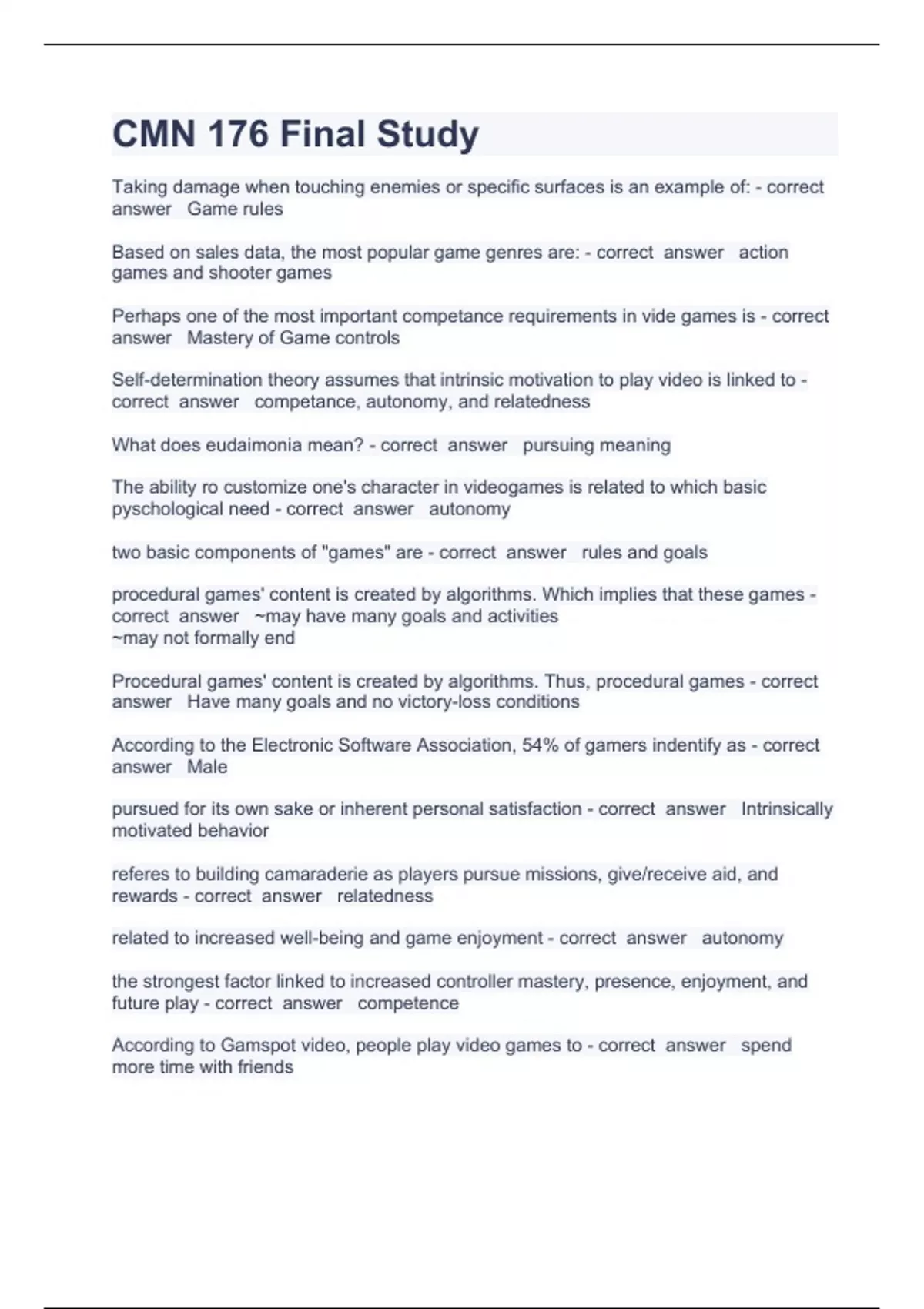 CMN 176 Final Study QuestTaking damage when touching enemies or specific surfaces is an example of: - correct answer Game rules Based on sales data, the most popular game genres are: - correct answer action games and shooter games Perhaps one of the most important competance requirements in vide games is - correct answer Mastery of Game controls Self-determination theory assumes that intrinsic motivation to play video is linked to - correct answer competance, autonomy, and relatedness What does eudaimonia mean? - correct answer pursuing meaning The ability ro customize one's character in videogames is related to which basic pyschological need - correct answer autonomy ion and answers 2023/2024 correctly solved