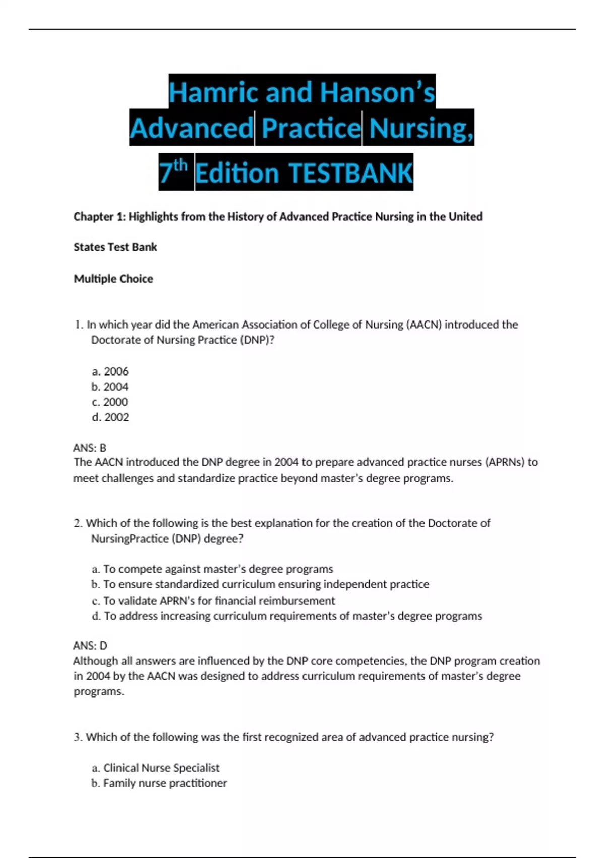 Hamric and Hanson’s Advanced Practice Nursing, 7th Edition TESTBANK 1. In which year did the American Association of College of Nursing (AACN) introduced the Doctorate of Nursing Practice (DNP)? a. 2006 b. 2004 c. 2000 d. 2002 ANS: B The AACN introduced the DNP degree in 2004 to prepare advanced practice nurses (APRNs) to meet challenges and standardize practice beyond master’s degree programs.