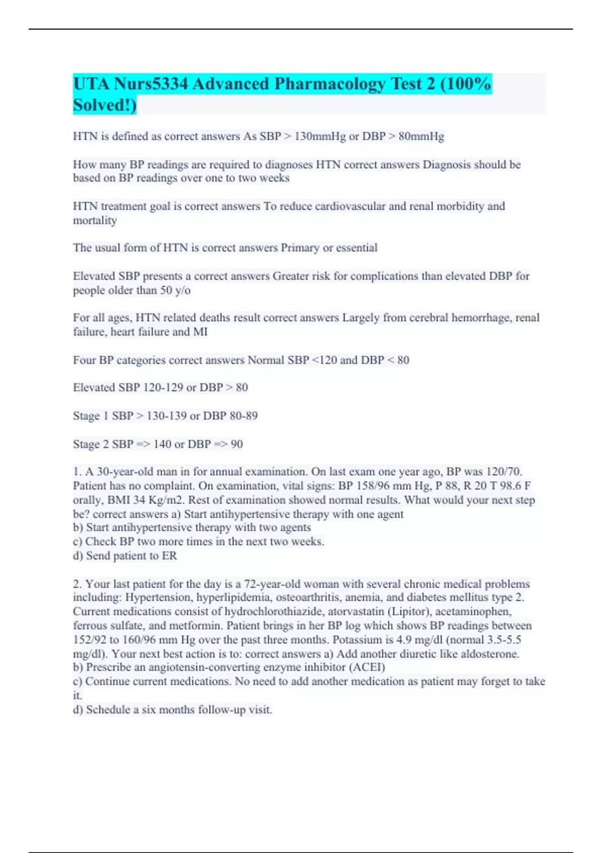 HTN is defined as correct answers As SBP > 130mmHg or DBP > 80mmHg How many BP readings are required to diagnoses HTN correct answers Diagnosis should be based on BP readings over one to two weeks HTN treatment goal is correct answers To reduce cardiovascular and renal morbidity and mortality The usual form of HTN is correct answers Primary or essential Elevated SBP presents a correct answers Greater risk for complications than elevated DBP for people older than 50 y/o For all ages, HTN related deaths result correct answers Largely from cerebral hemorrhage, renal failure, heart failure and MI Four BP categories correct answers Normal SBP <120 and DBP < 80 Elevated SBP 120-129 or DBP > 80 Stage 1 SBP > 130-139 or DBP 80-89 Stage 2 SBP => 140 or DBP => 90 1. A 30-year-old man in for annual examination. On last exam one year ago, BP was 120/70. Patient has no complaint. On examination, vital signs: BP 158/96 mm Hg, P 88, R 20 T 98.6 F orally, BMI 34 Kg/m2. Rest of examination showed normal results. What would your next step be? correct answers a) Start antihypertensive therapy with one agent b) Start antihypertensive therapy with two agents c) Check BP two more times in the next two weeks. d) Send patient to ER 2. Your last patient for the day is a 72-year-old woman with several chronic medical problems including: Hypertension, hyperlipidemia, osteoarthritis, anemia, and diabetes mellitus type 2. Current medications consist of hydrochlorothiazide, atorvastatin (Lipitor), acetaminophen, ferrous sulfate, and metformin. Patient brings in her BP log which shows BP readings between 152/92 to 160/96 mm Hg over the past three months. Potassium is 4.9 mg/dl (normal 3.5-5.5 mg/dl). Your next best action is to: correct answers a) Add another diuretic like aldosterone. b) Prescribe an angiotensin-converting enzyme inhibitor (ACEI) c) Continue current medications. No need to add another medication as patient may forget to take it. d) Schedule a six months follow-up visit.