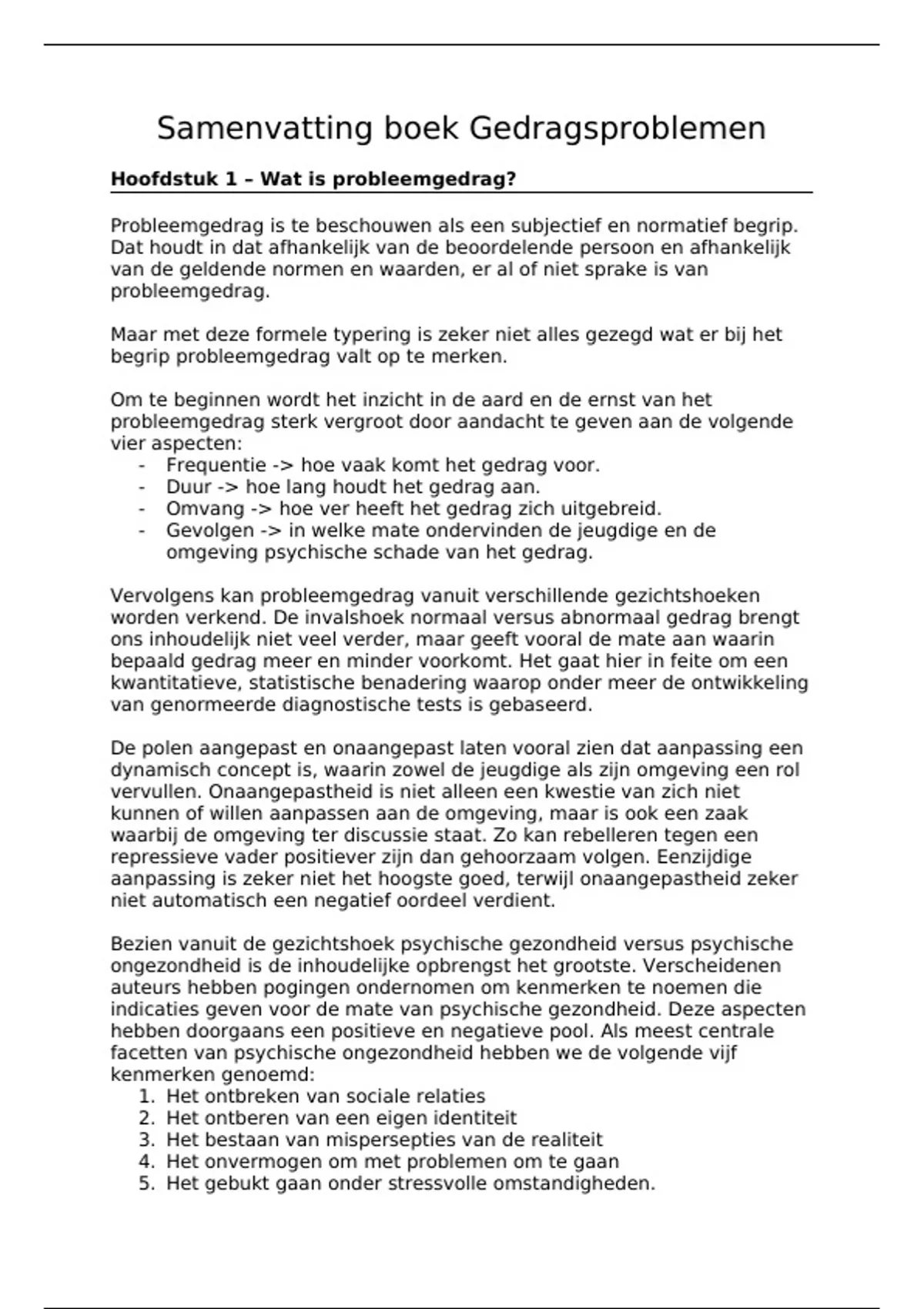 Samenvatting boek gedragsproblemen van Van der Ploeg. Alle hoofdstukken komen aanbod. Hoofdstuk 1 t/m 18. Daarnaast is er een overzicht van risicodragende factoren te vinden in de samenvatting en een verklarende woordenlijst
