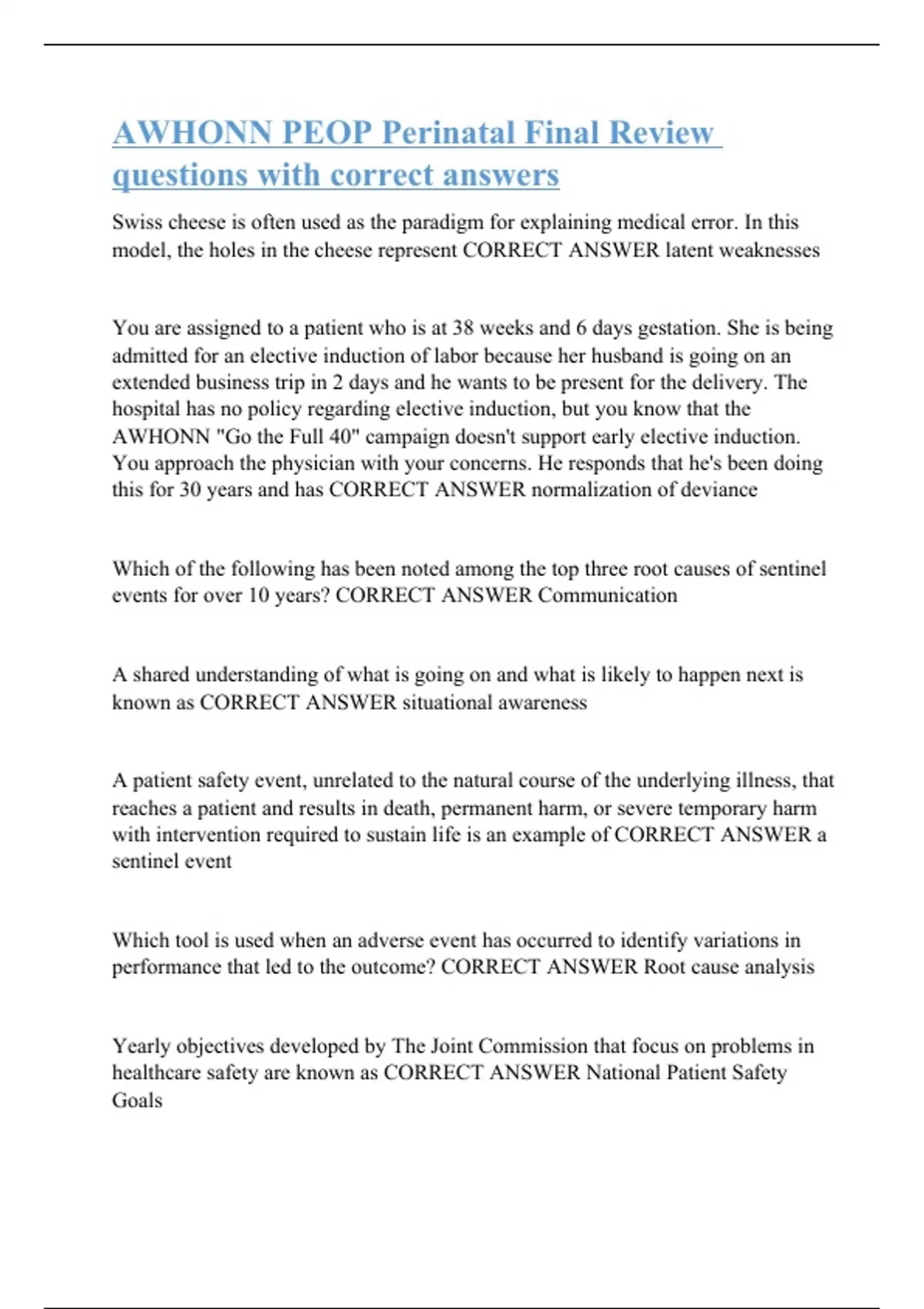 Swiss cheese is often used as the paradigm for explaining medical error. In this model, the holes in the cheese represent CORRECT ANSWER latent weaknesses You are assigned to a patient who is at 38 weeks and 6 days gestation. She is being admitted for an elective induction of labor because her husband is going on an extended business trip in 2 days and he wants to be present for the delivery. The hospital has no policy regarding elective induction, but you know that the AWHONN "Go the Full 40" campaign doesn't support early elective induction. You approach the physician with your concerns. He responds that he's been doing this for 30 years and has CORRECT ANSWER normalization of deviance Which of the following has been noted among the top three root causes of sentinel events for over 10 years? CORRECT ANSWER Communication A shared understanding of what is going on and what is likely to happen next is known as CORRECT ANSWER situational awareness A patient safety event, unrelated to the natural course of the underlying illness, that reaches a patient and results in death, permanent harm, or severe temporary harm with intervention required to sustain life is an example of CORRECT ANSWER a sentinel event Which tool is used when an adverse event has occurred to identify variations in performance that led to the outcome? CORRECT ANSWER Root cause analysis Yearly objectives developed by The Joint Commission that focus on problems in healthcare safety are known as CORRECT ANSWER National Patient Safety Goals