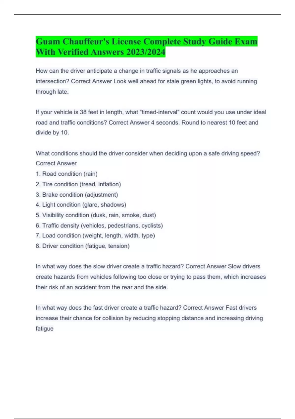 In what way does the fast driver create a traffic hazard? Correct Answer Fast drivers increase their chance for collision by reducing stopping distance and increasing driving fatigue What is the minimum following distance the driver of a commercial vehicle maintains when following another commercial vehicle outside of a business or residential district? Correct Answer 200 feet, 2 second rule, take car length to the nearest ten feet and divide by 10, 1 car length per 10 mph