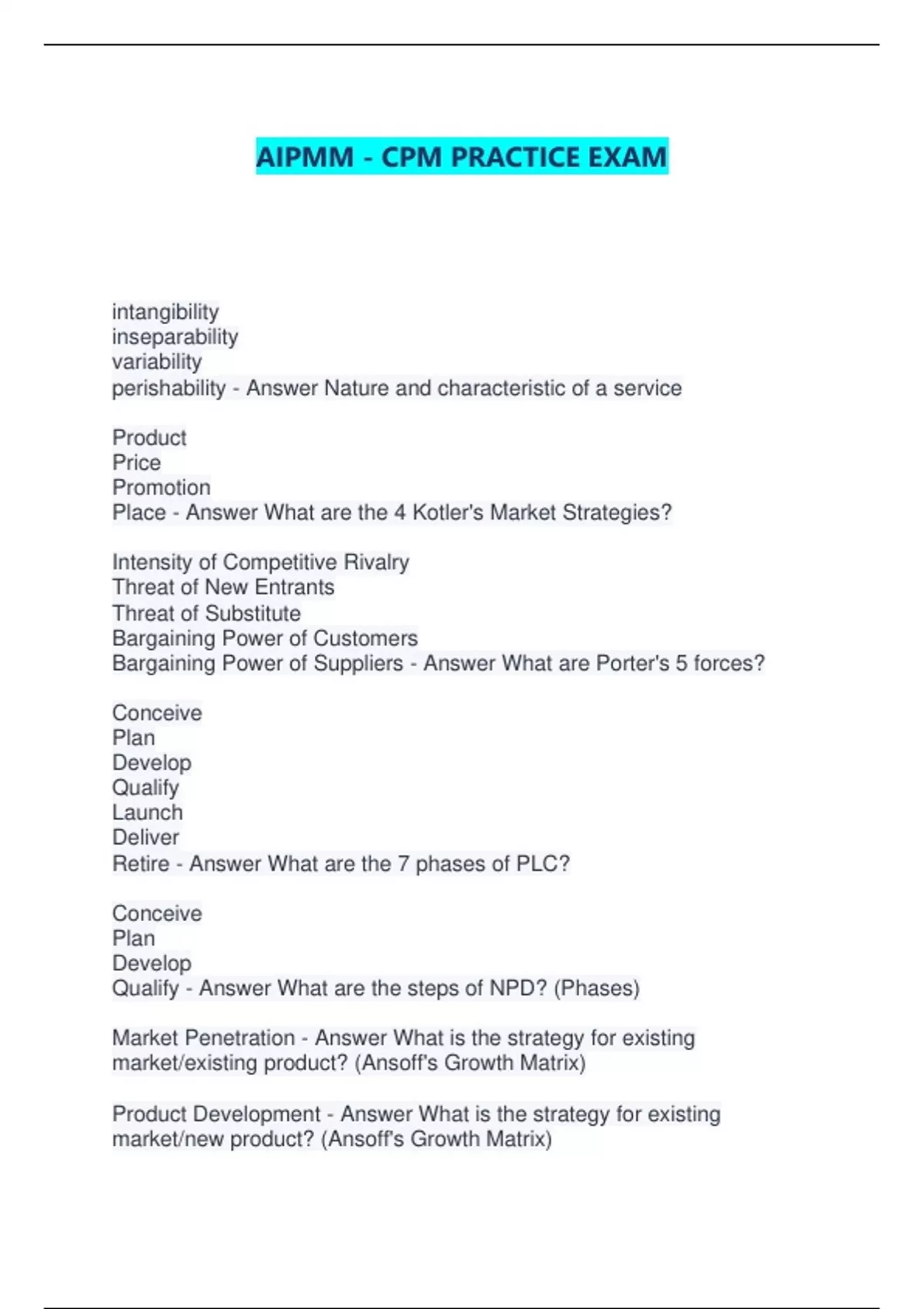 AIPMM - CPM PRACTICE EXAM intangibility inseparability variability perishability - Answer Nature and characteristic of a service Product Price Promotion Place - Answer What are the 4 Kotler's Market Strategies? Intensity of Competitive Rivalry Threat of New Entrants Threat of Substitute Bargaining Power of Customers Bargaining Power of Suppliers - Answer What are Porter's 5 forces? Conceive Plan Develop Qualify Launch Deliver Retire - Answer What are the 7 phases of PLC? Conceive Plan Develop Qualify - Answer What are the steps of NPD? (Phases) Market Penetration - Answer What is the strategy for existing market/existing product? (Ansoff's Growth Matrix) Product Development - Answer What is the strategy for existing market/new product? (Ansoff's Growth Matrix) Market Development - Answer What is the strategy for NEW market/existing product? (Ansoff's Growth Matrix) Diversification - Answer What is the strategy for new market/new product? (Ansoff's Growth Matrix) Introduction - Answer Market Objective: Gain awareness Competition: None Product: One Price: Skimming/Penetration Promotion: Educate/Inform Place: Limited Growth - Answer Market Objective: Stress differentiation Competition: Growing Product: More version Price: Gain market share Promotion: Competitive differences Place: more outlets Maturity - Answer Market Objective: Maintain brand loyalty Competition: Many Product: Full Price: Defend market share Promotion: Reminder oriented Place: Max outlets Decline - Answer Market Objective: Harvest/Deletion Competition: Reduced Product: Best Sellers Price: Stay profitable Promotion: Reduced Place: Few Product Manager roles - Answer Owns strategy Market expert Business case dev expert Presents needs Product Marketing Manager roles - Answer Market strategy Marketing expert Supports sales Guides marketing program Themes Golden Features Timed Releases - Answer What are the 3 types of organizing roadmaps? Styles Fad Fashion - Answer What are the 3 special lifecyles? Core Actual Product Augmented - Answer What are the three aspects of the whole product? Product definition - Answer It is tangible or intangible. Consumer - Answer It is type of product that the end user consume Convenience - Answer Type of product that is purchased frequently Shopping - Answer Type of product that is purchased less frequently and requires the comparison shopping Specialty - Answer Type of product that high priced and focused on brand differentiation/identification Unsought - Answer type of product that consumers dont want to think about Industrial Products - Answer type of product that is used for processing products/raw materials Materials and parts Capital items Supplies and services - Answer Three types of industrial products Service - Answer It is a product that is considered intangible Product line - Answer It is a group of closely related products that shares the similar attributes and target markets Create products beyond the current range of products - Answer Describe product decision where you are filling in the product line