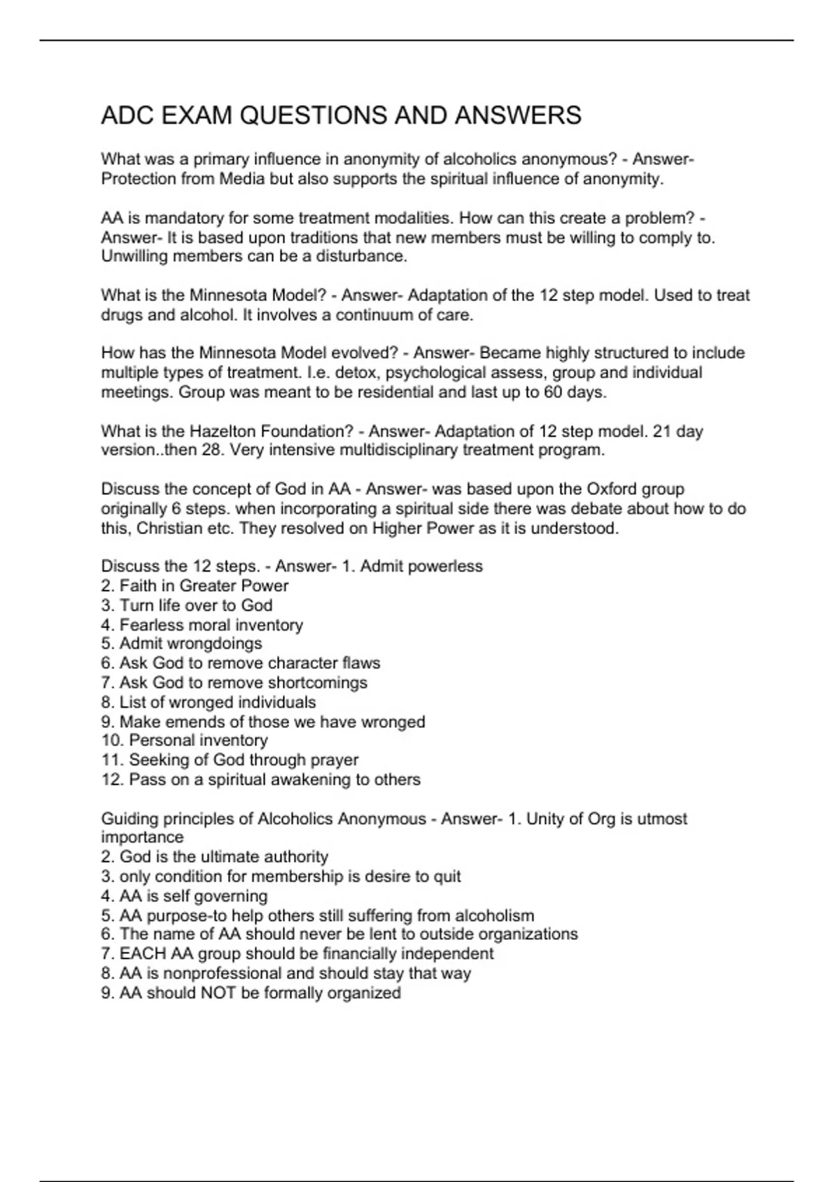 What was a primary influence in anonymity of alcoholics anonymous? - Answer- Protection from Media but also supports the spiritual influence of anonymity. AA is mandatory for some treatment modalities. How can this create a problem? - Answer- It is based upon traditions that new members must be willing to comply to. Unwilling members can be a disturbance. What is the Minnesota Model? - Answer- Adaptation of the 12 step model. Used to treat drugs and alcohol. It involves a continuum of care. How has the Minnesota Model evolved? - Answer- Became highly structured to include multiple types of treatment. I.e. detox, psychological assess, group and individual meetings. Group was meant to be residential and last up to 60 days. What is the Hazelton Foundation? - Answer- Adaptation of 12 step model. 21 day version..then 28. Very intensive multidisciplinary treatment program. Discuss the concept of God in AA - Answer- was based upon the Oxford group originally 6 steps. when incorporating a spiritual side there was debate about how to do this, Christian etc. They resolved on Higher Power as it is understood. Discuss the 12 steps. - Answer- 1. Admit powerless 2. Faith in Greater Power 3. Turn life over to God 4. Fearless moral inventory 5. Admit wrongdoings 6. Ask God to remove character flaws 7. Ask God to remove shortcomings 8. List of wronged individuals 9. Make emends of those we have wronged 10. Personal inventory 11. Seeking of God through prayer 12. Pass on a spiritual awakening to others Guiding principles of Alcoholics Anonymous - Answer- 1. Unity of Org is utmost importance 2. God is the ultimate authority 3. only c