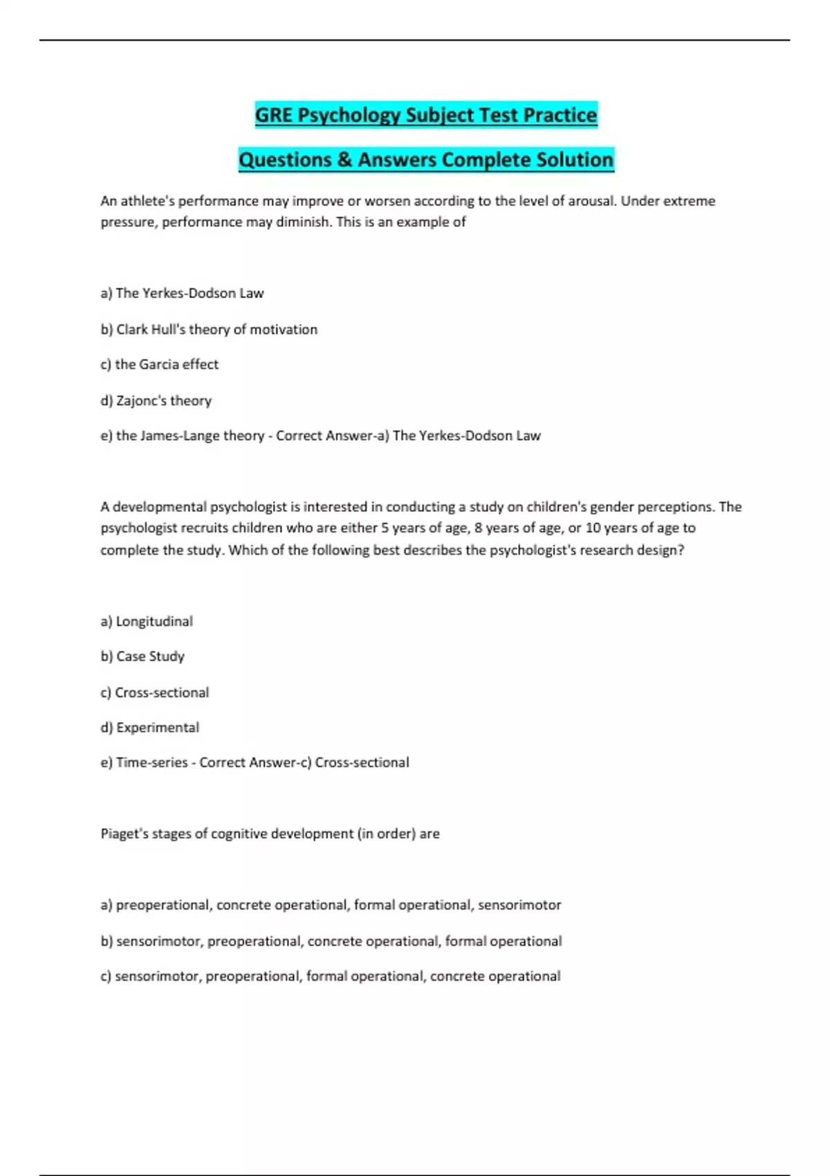 GRE Psychology Subject Test Practice Questions & Answers Complete Solution An athlete's performance may improve or worsen according to the level of arousal. Under extreme pressure, performance may diminish. This is an example of a) The Yerkes-Dodson Law b) Clark Hull's theory of motivation c) the Garcia effect d) Zajonc's theory e) the James-Lange theory - Correct Answer-a) The Yerkes-Dodson Law A developmental psychologist is interested in conducting a study on children's gender perceptions. The psychologist recruits children who are either 5 years of age, 8 years of age, or 10 years of age to complete the study. Which of the following best describes the psychologist's research design? a) Longitudinal b) Case Study c) Cross-sectional d) Experimental e) Time-series - Correct Answer-c) Cross-sectional Piaget's stages of cognitive development (in order) are a) preoperational, concrete operational, formal operational, sensorimotor b) sensorimotor, preoperational, concrete operational, formal operational c) sensorimotor, preoperational, formal operational, concrete operational d) preoperational, formal operational, concrete operational, sensorimotor e) preoperational, conservation, egocentric, scientist - Correct Answer-b) sensorimotor, preoperational, concrete operational, formal operational The term 'vicarious reinforcement' was coined by a) John Dewey b) Albert Bandura c) William James d) Carl Rogers e) Kurt Lewin - Correct Answer-b) Albert Bandura Which of the following Gestalt laws refers to perceptual organization as being as "good" as possible? a) Closure b) Proximity c) Similarity d) Good continuation e) Prägnanz - Correct Answer-e) Prägnanz At dinner, Karen's brother spills his drink on the table; Karen concludes this happened because he is clumsy and careless. This is an example of the a) social facilitation theory b) social exchange theory c) halo effect CONTINUES...