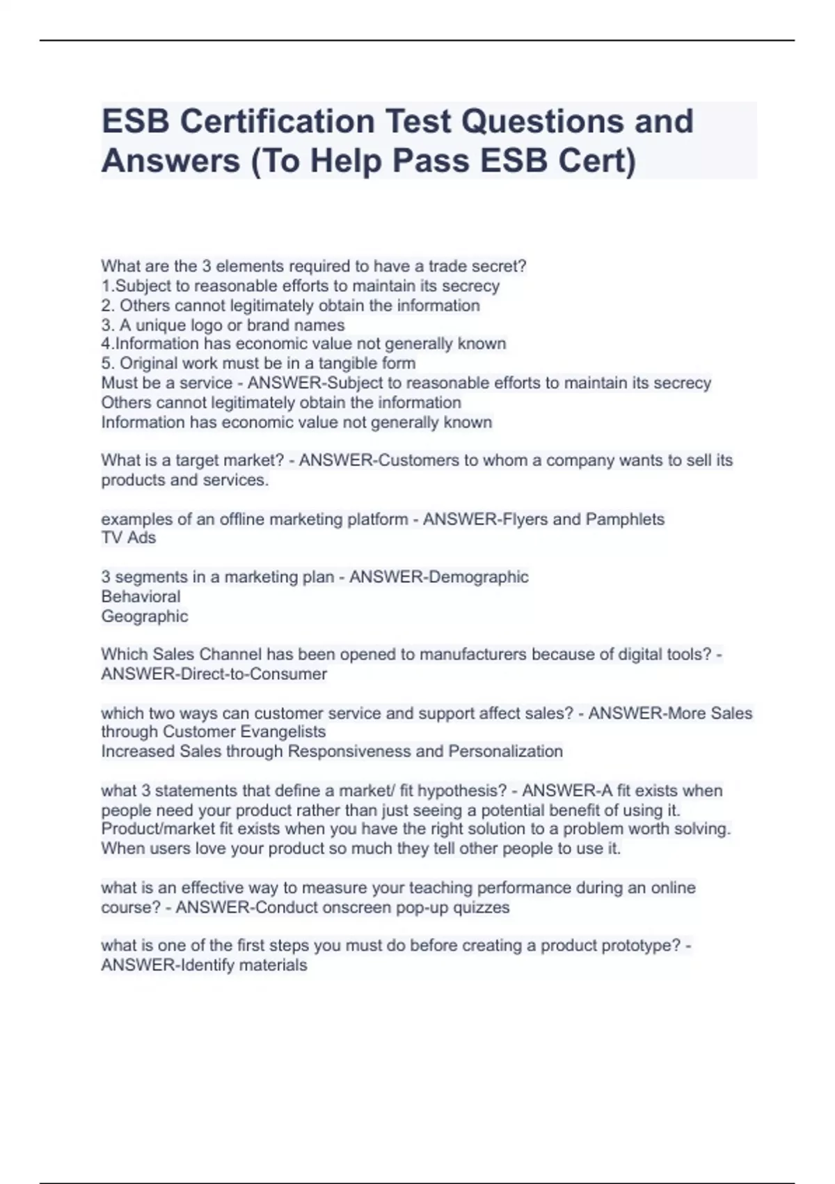 ESB Certification Test Questions and Answers (To Help Pass ESB Cert) ESB Certification Test Questions and Answers (To Help Pass ESB Cert) ESB Certification Test Questions and Answers (To Help Pass ESB Cert) What are the 3 elements required to have a trade secret? 1.Subject to reasonable efforts to maintain its secrecy 2. Others cannot legitimately obtain the information 3. A unique logo or brand names 4.Information has economic value not generally known 5. Original work must be in a tangible form Must be a service - ANSWER-Subject to reasonable efforts to maintain its secrecy Others cannot legitimately obtain the information Information has economic value not generally known What is a target market? - ANSWER-Customers to whom a company wants to sell its products and services.