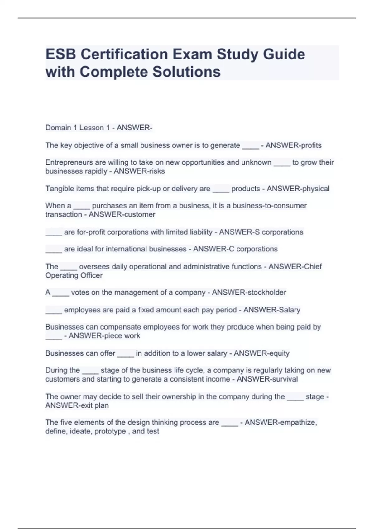 ESB Certification Exam Study Guide with Complete Solutions ESB Certification Exam Study Guide with Complete Solutions ESB Certification Exam Study Guide with Complete Solutions Domain 1 Lesson 1 - ANSWER- The key objective of a small business owner is to generate ____ - ANSWER-profits Entrepreneurs are willing to take on new opportunities and unknown ____ to grow their businesses rapidly - ANSWER-risks Tangible items that require pick-up or delivery are ____ products - ANSWER-physical When a ____ purchases an item from a business, it is a business-to-consumer transaction - ANSWER-customer ____ are for-profit corporations with limited liability - ANSWER-S corporations ____ are ideal for international businesses - ANSWER-C corporations
