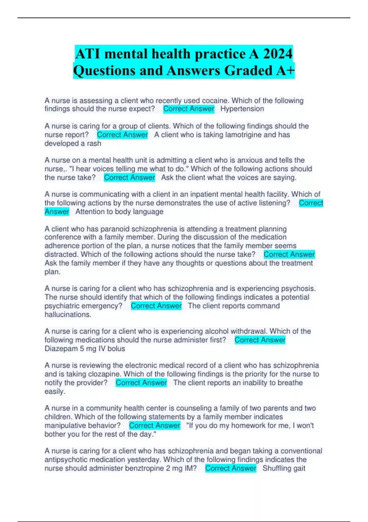 ATI mental health practice A 2024 Questions and Answers Graded A+