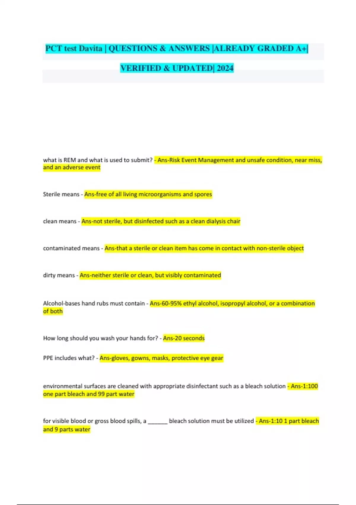 PCT test Davita | QUESTIONS & ANSWERS |ALREADY GRADED A+| VERIFIED & UPDATED| 2024 what is REM and what is used to submit? - Ans-Risk Event Management and unsafe condition, near miss, and an adverse event Sterile means - Ans-free of all living microorganisms and spores clean means - Ans-not sterile, but disinfected such as a clean dialysis chair contaminated means - Ans-that a sterile or clean item has come in contact with non-sterile object dirty means - Ans-neither sterile or clean, but visibly contaminated Alcohol-bases hand rubs must contain - Ans-60-95% ethyl alcohol, isopropyl alcohol, or a combination of both How long should you wash your hands for? - Ans-20 seconds PPE includes what? - Ans-gloves, gowns, masks, protective eye gear environmental surfaces are cleaned with appropriate disinfectant such as a bleach solution - Ans-1:100 one part bleach and 99 part water for visible blood or gross blood spills, a ______ bleach solution must be utilized - Ans-1:10 1 part bleach and 9 parts water