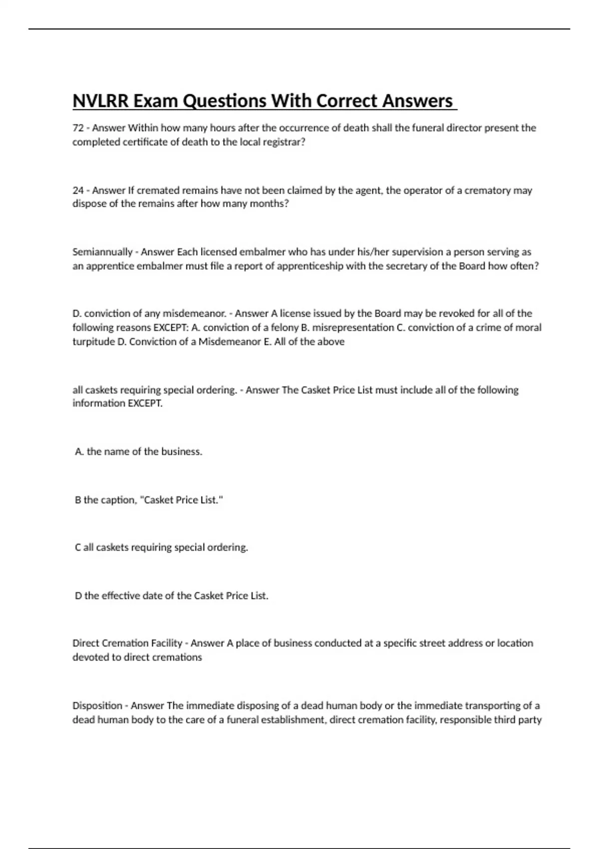 72 - Answer Within how many hours after the occurrence of death shall the funeral director present the completed certificate of death to the local registrar? 24 - Answer If cremated remains have not been claimed by the agent, the operator of a crematory may dispose of the remains after how many months? Semiannually - Answer Each licensed embalmer who has under his/her supervision a person serving as an apprentice embalmer must file a report of apprenticeship with the secretary of the Board how often? D. conviction of any misdemeanor. - Answer A license issued by the Board may be revoked for all of the following reasons EXCEPT: A. conviction of a felony B. misrepresentation C. conviction of a crime of moral turpitude D. Conviction of a Misdemeanor E. All of the above all caskets requiring special ordering. - Answer The Casket Price List must include all of the following information EXCEPT. A. the name of the business. B the caption, "Casket Price List." C all caskets requiring special ordering. D the effective date of the Casket Price List. Direct Cremation Facility - Answer A place of business conducted at a specific street address or location devoted to direct cremations Disposition - Answer The immediate disposing of a dead human body or the immediate transporting of a dead human body to the care of a funeral establishment, direct cremation facility, responsible third party or the immediate family for direct cremation or burial. Funeral Arranger - Answer any person employed by a funeral establishment or direct cremation facility who meets with families, or other persons authorized pursuant to NRS 451.024 to order the disposition of human remains of a deceased person, to plan funeral services for a decedent. Funeral Director - Answer a person engaged in, conducting the business of or holding himself or herself out as engaged in: (a) Preparing or contracting to prepare by embalming or in any other manner dead human bodies for burial, cremation or disposal, or directing and supervising the burial, cremation or disposal of dead human bodies. (b) Directing, supervising or contracting to direct or supervise funerals. (c) The business of a funeral director by using the words "funeral director," "mortician" or any other title implying that the person is engaged in the business of funeral directing. (a) A licensed embalmer, a funeral arranger or a person whose duties are limited to conducting direct cremations or immediate burials. (b) An owner of a funeral establishment or direct cremation facility, unless the owner engages in any activity described in subsection 1. - Answer Term Funeral Director does not include: Funeral Establishment - Answer a place of business conducted at a specific street address or location devoted to the care and preparation for burial, cremation or transportation of dead human bodies, consisting of a preparation room equipped with a sanitary floor, necessary drainage and ventilation, having access to necessary instruments and supplies for the preparation and embalming of dead human bodies for burial or transportation and having a display room containing an inventory of funeral caskets. NRS 642.018 Exclusions - Answer 1. Persons engaged as layers-out or to those who shroud the dead. 2. Employees of any cemetery whose duty or business extends no further. 3. Officers or employees of any state or federal institution. 4. A person who inters the human remains of a native Indian pursuant to NRS 383.150 to 383.190, inclusive. 5. Commissioned officers serving in the Armed Forces of the United States. 6. Persons who provide services regarding funerals for or the burial of pets only. (a) Fails to submit the statement required pursuant to subsection 1; or (b) Indicates on the statement submitted pursuant to subsection 1 that the applicant is subject to a court order for the support of a child and is not in compliance with the order or a plan approved by the district attorney or other public agency enforcing the order for the repayment of the amount owed pursuant to the order. - Answer Relating to applicants who have claims of arrearage of child support claims under the Division of Welfare and Supportive Services, a license may not be issued, may be revoked, or not renewed if an applicant... One Year; National Veteran's Cemetery; Department of Veteran's Services - Answer A funeral director who obtains custody of unclaimed human remains who the funeral director knows, or has reason to believe is a veteran, the funeral director must report the name of the deceased person no later than ________________ after obtaining the remains. If the remains are determined to be those of an eligible veteran for burial in a National Cemetery, the funeral director must arrange for disposition in said cemetery with a ___________________ or with the __________________________. Seven; appointed; (a) Two members who are actively engaged as a funeral director or embalmer. (b) One member who is actively engaged as an operator of a cemetery. (c) One member who is actively engaged in the operation of a crematory or direct cremation facility. (d) Three members who are representatives of the general public. - Answer The Nevada Funeral and Cemetery Services Board, consists of __________ number of members, who will be _____________by the governor, consisting of: (a) Be the holder of a license, permit or certificate issued by the Board or be an applicant or former applicant for such a license, permit or certificate. (b) Be related within the third degree of consanguinity or affinity to the holder of a license, permit or certificate issued by the Board. (c) Be employed by the holder of a license, permit or certificate issued by the Board. - Answer No member of the Board who is of the general public may: (a) A salary of not more than $150 per day, as fixed by the Board, while engaged in the business of the Board; and (b) A per diem allowance and travel expenses at a rate fixed by the Board, while engaged in the b