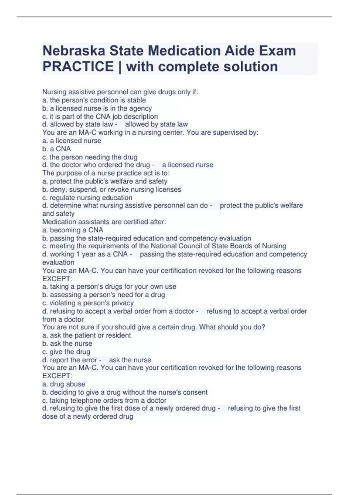 Nebraska State Medication Aide Exam PRACTICE | with complete solution Nursing assistive personnel can give drugs only if: a. the person's condition is stable b. a licensed nurse is in the agency c. it is part of the CNA job description d. allowed by state law - allowed by state law You are an MA-C working in a nursing center. You are supervised by: a. a licensed nurse b. a CNA c. the person needing the drug d. the doctor who ordered the drug - a licensed nurse The purpose of a nurse practice act is to: a. protect the public's welfare and safety b. deny, suspend, or revoke nursing licenses c. regulate nursing education d. determine what nursing assistive personnel can do - protect the public's welfare and safety Medication assistants are certified after: a. becoming a CNA b. passing the state-required education and competency evaluation c. meeting the requirements of the National Council of State Boards of Nursing d. working 1 year as a CNA - passing the state-required education and competency evaluation You are an MA-C. You can have your certification revoked for the following reasons EXCEPT: a. taking a person's drugs for your own use b. assessing a person's need for a drug c. violating a person's privacy d. refusing to accept a verbal order from a doctor - refusing to accept a verbal order from a doctor You are not sure if you should give a certain drug. What should you do? a. ask the patient or resident b. ask the nurse c. give the drug d. report the error - ask the nurse You are an MA-C. You can have your certification revoked for the following reasons EXCEPT: a. drug abuse b. deciding to give a drug without the nurse's consent c. taking telephone orders from a doctor d. refusing to give the first dose of a newly ordered drug - refusing to give the first dose of a newly ordered drug Which agency can deny, revoke, or suspend an MA-C's certification? a. the state board of nursing b. the state regulatory agency responsible for MA-C's c. the national council of State Boards of Nursing d. the agency in which the MA-C is employed - the state regulatory agency responsible for MA-C's On your days off, you call the agency to check on a patient. This is a: a. professional boundary b. boundary crossing c. boundary violation d. boundary sign - boundary sign To maintain professional boundaries, your behaviors must: a. help the person b. meet your needs c. be biased d. show that you care - help the person A patient asks you out to dinner. You accept. This is a: a. prof