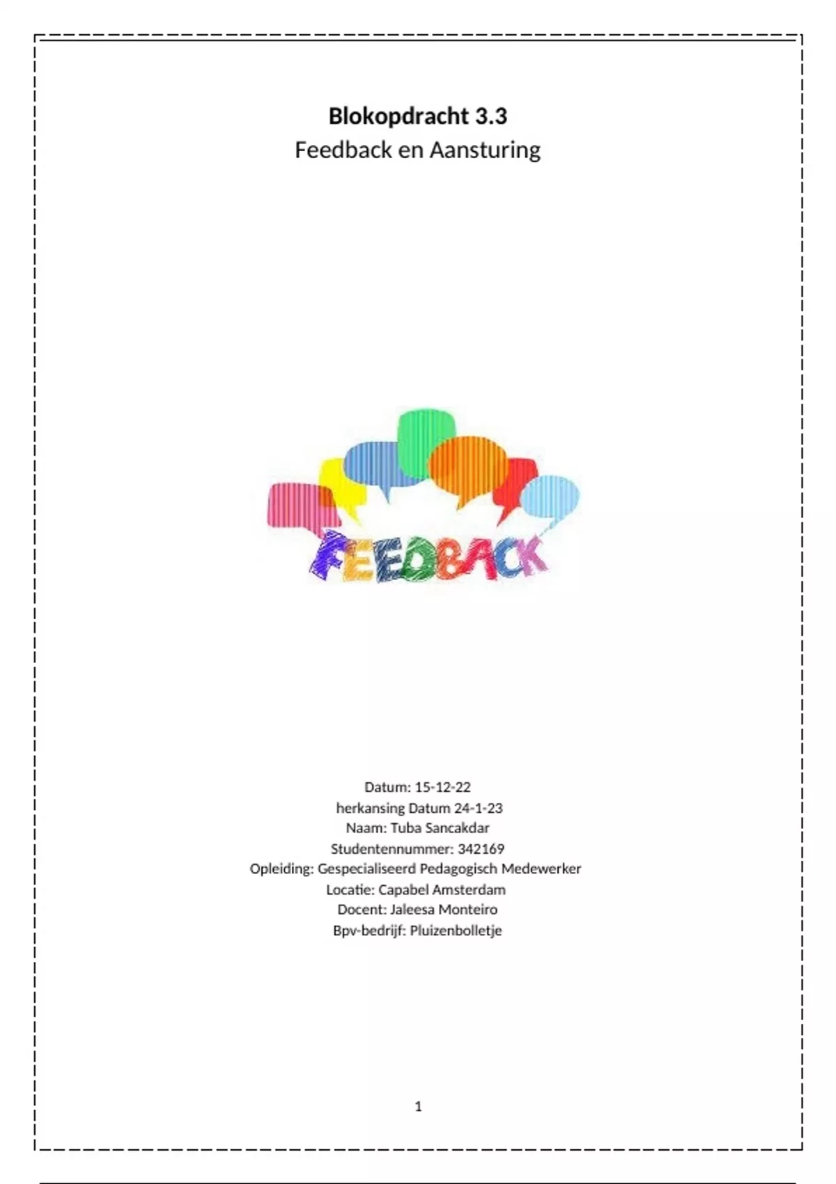 Welkom bij Blokopdracht 3.3 Feedback en aansturing. De opdracht is volledig uitgewerkt volgens de criteria en in 1x goedgekeurd. Incl. -20 kenmerken -Feedbacklijst -Vragen met antwoorden -Reflectieverslag