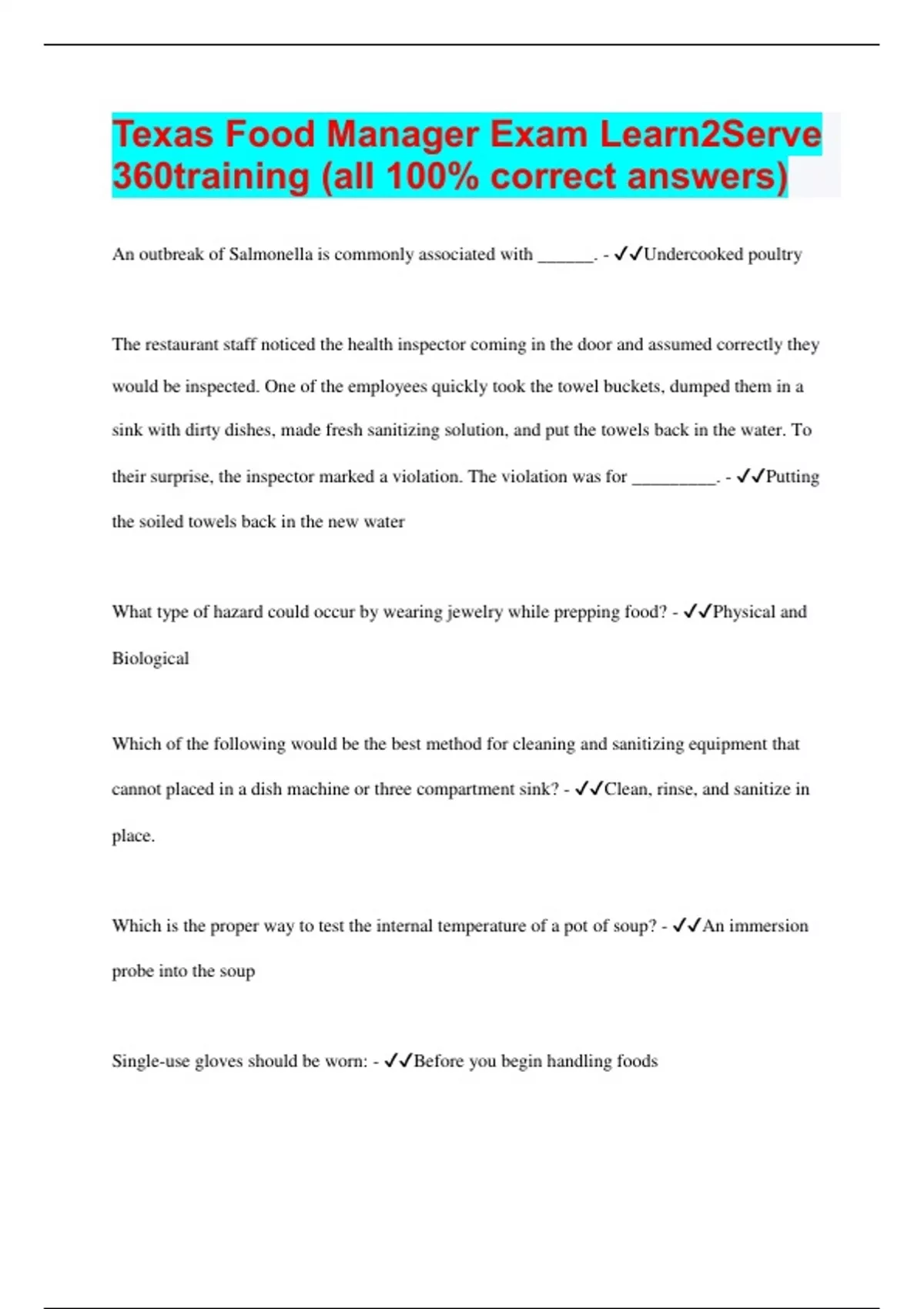 Texas Food Manager Exam Learn2Serve 360training (all 100% correct answers) An outbreak of Salmonella is commonly associated with ______. - ✔✔Undercooked poultry The restaurant staff noticed the health inspector coming in the doo r and assumed correctly they would be inspected. One of the employees quickly took the towel buckets, dumped them in a sink with dirty dishes, made fresh sanitizing solution, and put the towels back in the water. To their surprise, the inspector marked a v iolation. The violation was for _________. - ✔✔Putting the soiled towels back in the new water What type of hazard could occur by wearing jewelry while prepping food? - ✔✔Physical and Biological Which of the following would be the best method for cleaning and sanitizing equipment that cannot placed in a dish machine or three compartment sink? - ✔✔Clean, rinse, and sanitize in place. Which is the proper way to test the internal temperature of a pot of soup? - ✔✔An immersion probe into the soup Single -use gloves should be worn: - ✔✔Before you begin handling foods PHF stands for ______. - ✔✔Potentially hazardous food Bacterial growth can be minimized by properly controlling ______. - ✔✔Time, Temperature, Oxygen, Moisture. Which is an example of a cross -connection? - ✔✔A hose in a mop bucket A prep cook must be sure to wash hands well _________. - ✔✔All of the above Shellstock identification tags on shellfish must include the harvester's ID number, the date and location of harvest, the type of shellfish and a statement proclaiming that ______. - ✔✔The tag must be kept for 90 days. If hot water is not available in the ware -washing sink, food establishments can still serve food using ______. - ✔✔Single use utensils The entire handwashing process should take _____ seconds. - ✔✔20 Which of the following is an acceptable source of potable water? - ✔✔Private well water An employee who is assigned to clean the frozen dessert dispenser at the end of the night must use CIP systems. CIP is an acronym for _______. - ✔✔Clean in place