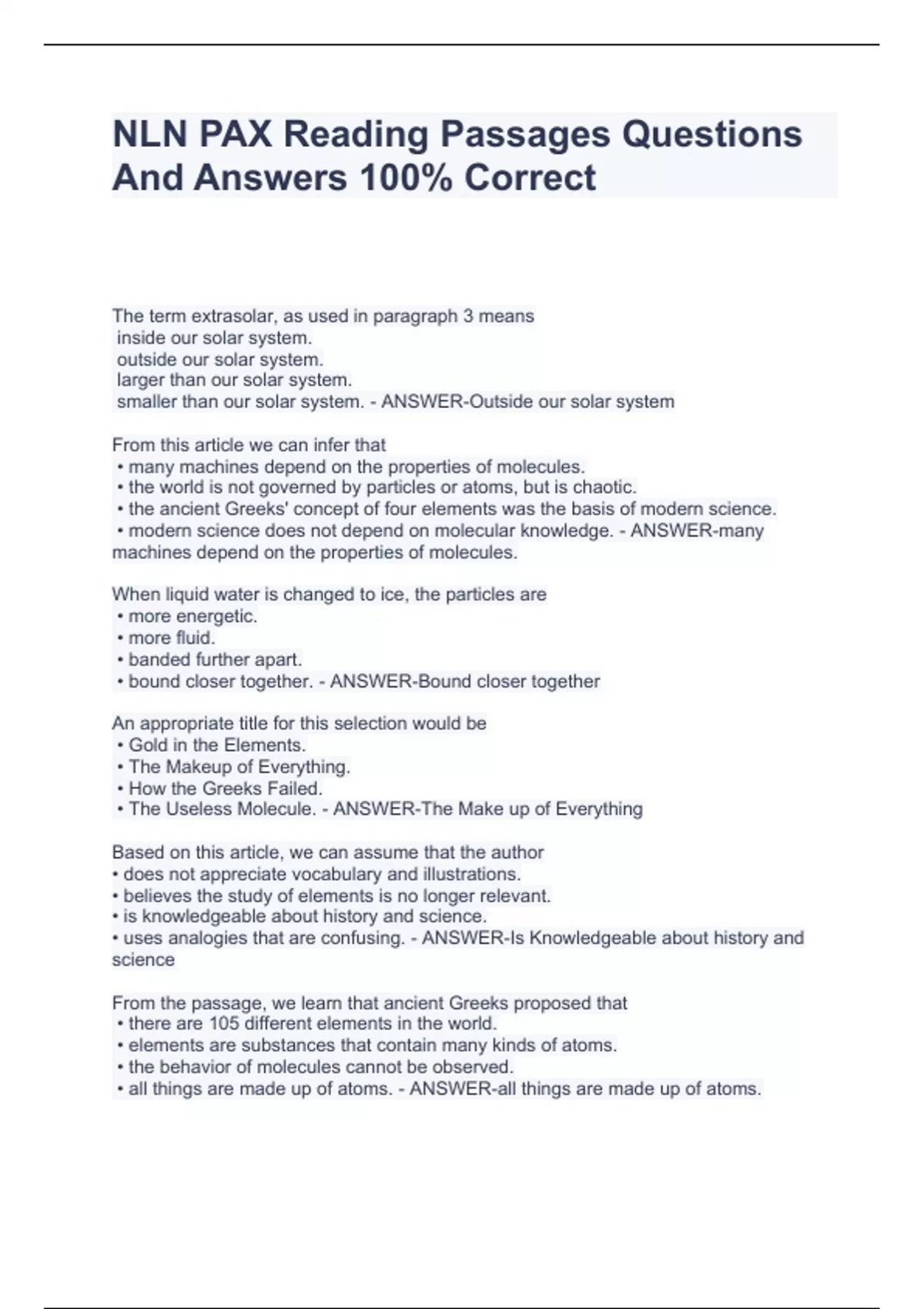 NLN PAX Reading Passages Questions And Answers 100% Correct The term extrasolar, as used in paragraph 3 means inside our solar system. outside our solar system. larger than our solar system. smaller than our solar system. - ANSWER-Outside our solar system From this article we can infer that • many machines depend on the properties of molecules. • the world is not governed by particles or atoms, but is chaotic. • the ancient Greeks' concept of four elements was the basis of modern science. • modern science does not depend on molecular knowledge. - ANSWER-many machines depend on the properties of molecules. When liquid water is changed to ice, the particles are • more energetic. • more fluid. • banded further apart. • bound closer together. - ANSWER-Bound closer together An appropriate title for this selection would be • Gold in the Elements. • The Makeup of Everything. • How the Greeks Failed. • The Useless Molecule. - ANSWER-The Make up of Everything Based on this article, we can assume that the author • does not appreciate vocabulary and illustrations. • believes the study of elements is no longer relevant. • is knowledgeable about history and science. • uses analogies that are confusing. - ANSWER-Is Knowledgeable about history and science
