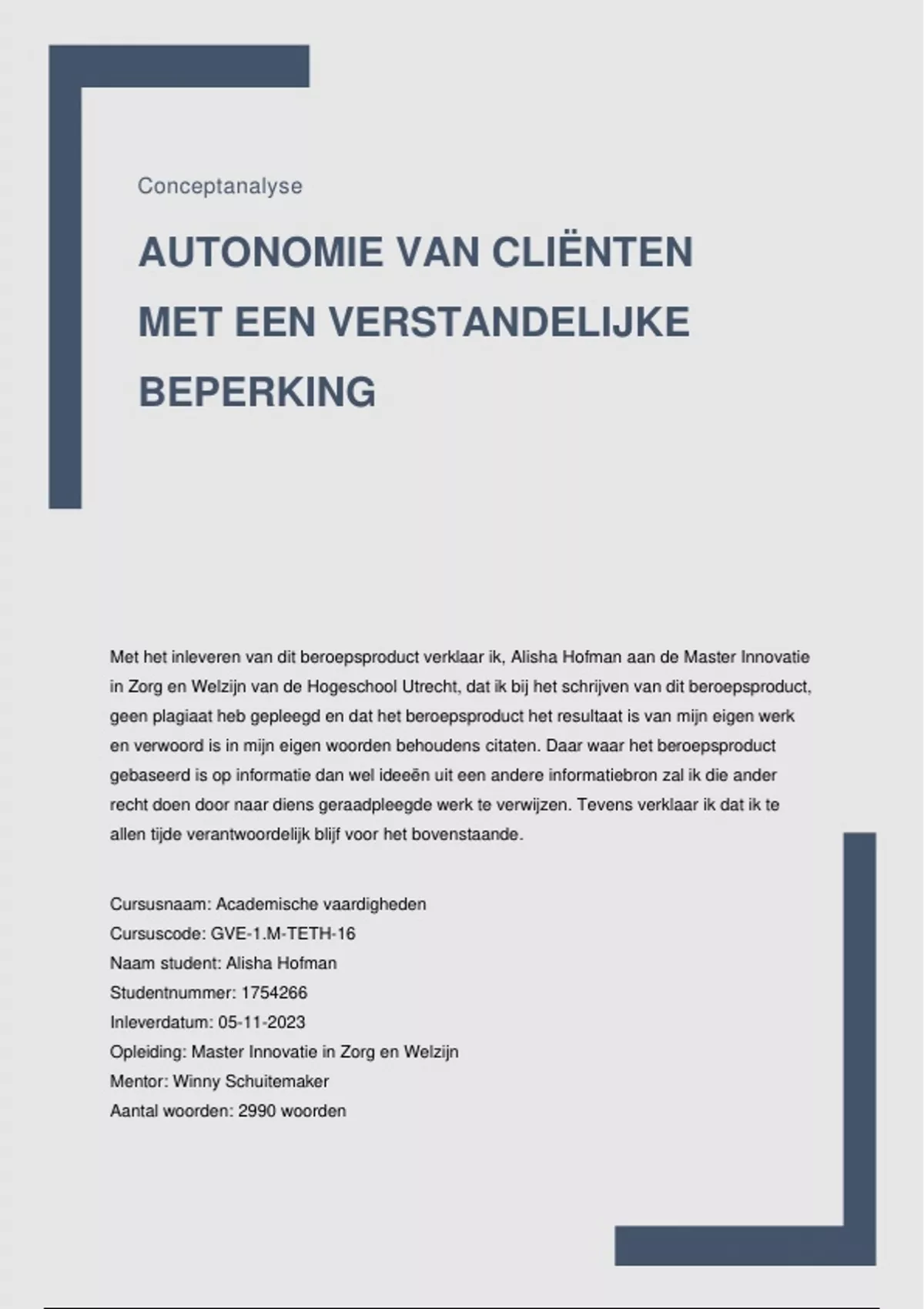 De Conceptanalyse betreft autonomie van cliënten met een verstandelijke beperking. Afgerond met een 7,6!