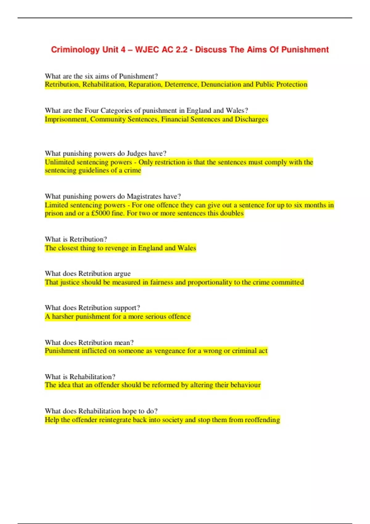 Criminology Unit 4 – WJEC AC 2.2 - Discuss The Aims Of Punishment