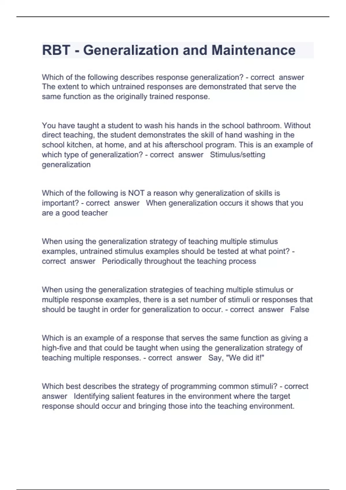 RBT2 Question and answers correctly solved 2023/2024Which of the following describes response generalization? - correct answer The extent to which untrained responses are demonstrated that serve the same function as the originally trained response. You have taught a student to wash his hands in the school bathroom. Without direct teaching, the student demonstrates the skill of hand washing in the school kitchen, at home, and at his afterschool program. This is an example of which type of generalization? - correct answer Stimulus/setting generalization