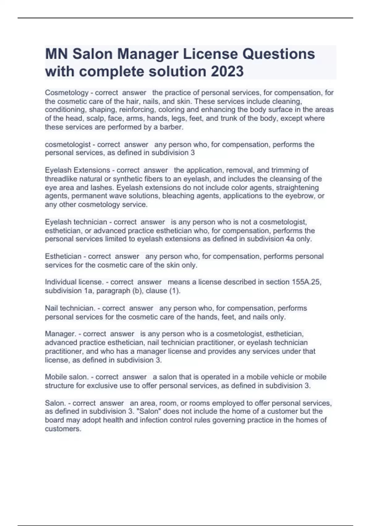 MN Salon Manager License Questions with complete solution 2023/2024 Cosmetology - correct answer the practice of personal services, for compensation, for the cosmetic care of the hair, nails, and skin. These services include cleaning, conditioning, shaping, reinforcing, coloring and enhancing the body surface in the areas of the head, scalp, face, arms, hands, legs, feet, and trunk of the body, except where these services are performed by a barber. cosmetologist - correct answer any person who, for compensation, performs the personal services, as defined in subdivision 3 Eyelash Extensions - correct answer the application, removal, and trimming of threadlike natural or synthetic fibers to an eyelash, and includes the cleansing of the eye area and lashes. Eyelash extensions do not include color agents, straightening agents, permanent wave solutions, bleaching agents, applications to the eyebrow, or any other cosmetology service. Eyelash technician - correct answer is any person who is not a cosmetologist, esthetician, or advanced practice esthetician who, for compensation, performs the personal services limited to eyelash extensions as defined in subdivision 4a only.