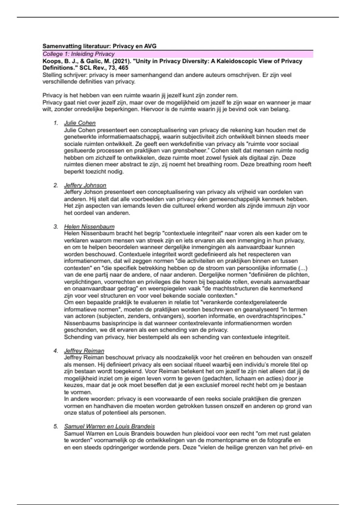 Deze samenvatting betreft een samenvatting de voorgeschreven literatuur van het vak Privacy en Bescherming Persoonsgegevens. De literatuur staat in het document opgenomen.