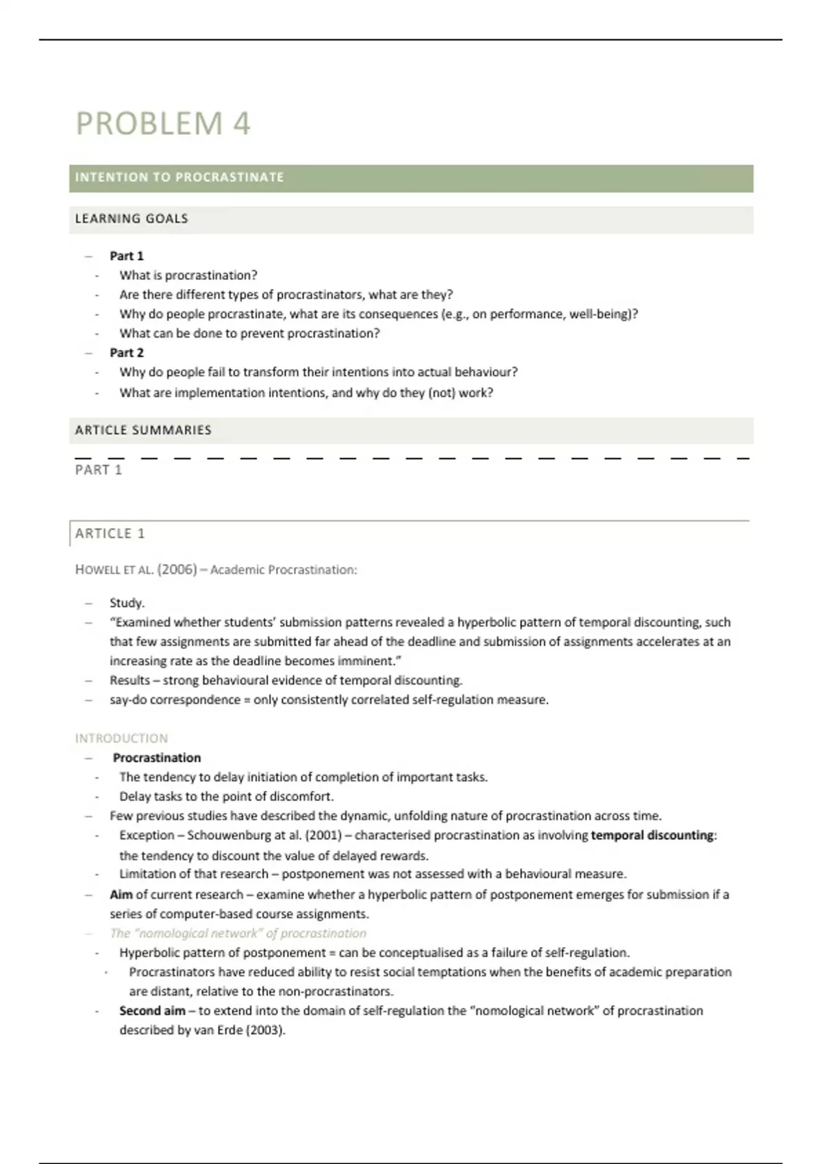 Extremely detailed literature summary from Problem 1 of the elective motivation, self-regulation, and performance. Written in English by GPA 8 honours student. Very very detailed and quite long, written in bulletpoints but a slightly narrative format. Can be used solely and not read original sources and still understand all articles - the only summary you need for high marks on the exam. Summaries for the remaining problems are/will be made available. I received a grade >8.5 and my roommate (who only used this summary) received a grade of >8.