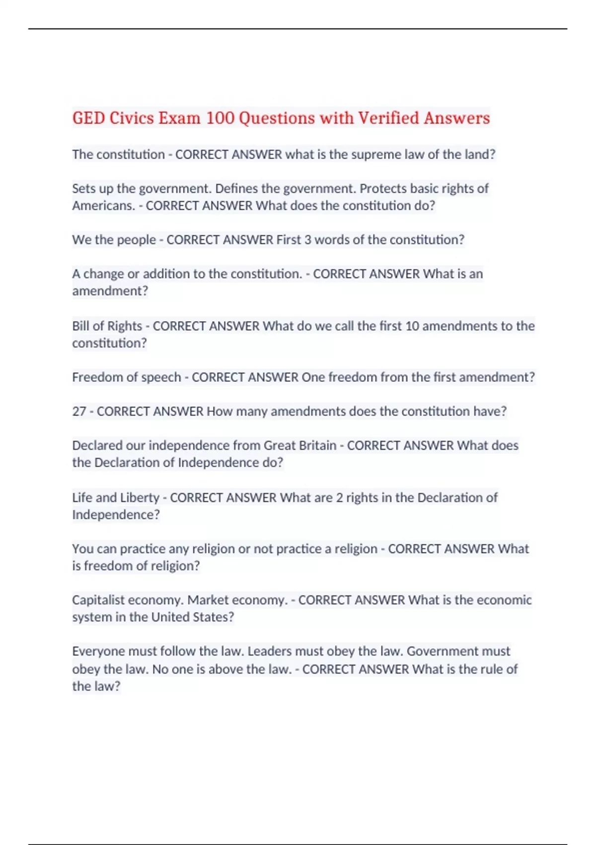 GED Civics Exam 100 Questions with Verified Answers The constitution - CORRECT ANSWER what is the supreme law of the land? Sets up the government. Defines the government. Protects basic rights of Americans. - CORRECT ANSWER What does the constitution do? We the people - CORRECT ANSWER First 3 words of the constitution? A change or addition to the constitution. - CORRECT ANSWER What is an amendment? Bill of Rights - CORRECT ANSWER What do we call the first 10 amendments to the constitution? Freedom of speech - CORRECT ANSWER One freedom from the first amendment? 27 - CORRECT ANSWER How many amendments does the constitution have? Declared our independence from Great Britain - CORRECT ANSWER What does the Declaration of Independence do? Life and Liberty - CORRECT ANSWER What are 2 rights in the Declaration of Independence? You can practice any religion or not practice a religion - CORRECT ANSWER What is freedom of religion? Capitalist economy. Market economy. - CORRECT ANSWER What is the economic system in the United States? Everyone must follow the law. Leaders must obey the law. Government must obey the law. No one is above the law. - CORRECT ANSWER What is the rule of the law? Congress - CORRECT ANSWER Name one branch of the government Checks and balances. Separation of powers. - CORRECT ANSWER What stops one brand of government from becoming too powerful? The president - CORRECT ANSWER Who is in charge of the executive branch? Congress. Senate and House. Legislators. - CORRECT ANSWER Who makes federal laws? The Senate and House (of representatives) - CORRECT ANSWER What are the 2 parts of the U.S. Congress? 100 - CORRECT ANSWER How many U.S. Senators are there? 6 - CORRECT ANSWER We elect a U.S. Senator for how many years? Ron Johnson - CORRECT ANSWER Who is one of your states U.S. Senators now? 435 - CORRECT ANSWER The House of Representatives has how many voting members? 2 - CORRECT ANSWER We elect a U.S. Representative for how many years? Paul Ryan - CORRECT ANSWER Name your U.S. Representative All people of the state - CORRECT ANSWER Who does a U.S. Senator represent? The states population - CORRECT ANSWER Who do some states have more representatives than other states? 4 - CORRECT ANSWER We elect a president for how many years? November - CORRECT ANSWER In what month do we vote for President? Donald Trump - CORRECT ANSWER What is the name of the President of the United States now? Mike Pence - CORRECT ANSWER What is the name of the Vice President of the United States now? The Vice President - CORRECT ANSWER If the President can no longer serve, who becomes President? Speaker of the House - CORRECT ANSWER If both the President and the Vice President can no longer serve, who becomes President? The President - CORRECT ANSWER Who is the commander in chief of the military? The President - CORRECT ANSWER Who signs bills to become laws? The President - CORRECT ANSWER Who vetoes bills? Advices the President - CORRECT ANSWER What does the Presidents cabinet do? Secretary of State. Secretary of Defence. - CORRECT ANSWER What are 2 Cabinet-level positions? Reviews laws. Explains laws. Resolves disputes. Decides if a law goes against the Constitution. - CORRECT ANSWER What does the judicial branch do? The Surpreme Court - CORRECT ANSWER What is the highest court in the United States? 9 - CORRECT ANSWER How many justices are on the surpreme court? John Roberts - CORRECT ANSWER Who is the Chief Justice of the United States now? To print money - CORRECT ANSWER What is one power of the federal government? Provide protection - CORRECT ANSWER What is one power of the states? Scott Walker - CORRECT ANSWER Who is the Governor of your state now? Madison - CORRECT ANSWER What is the capitol of your state? Democratic and Republican - CORRECT ANSWER What are the 2 major political parties of the United States? Republican - CORRECT ANSWER What is the political party of the President now? Paul Ryan - CORRECT ANSWER What is the name of the Speaker of the House of Representatives now? Citizens 18 and older can vote - CORRECT ANSWER What is one of the four amendments of the constitution about who can vote? Serve on a jury. Vote in a federal election. - CORRECT ANSWER Name one responsibility that is only for U.S. Citizens Vote in a federal election. Run for federal office. - CORRECT ANSWER Name one right only for a U.S. Citizens Freedom of speech. Freedom of religion. - CORRECT ANSWER What are 2 rights for everyone living in the United States? The United States. The flag. - CORRECT ANSWER What do we show loyalty to when we say the Pledge of Allegiance? Be loyal to the United States - CORRECT ANSWER What is one promise you make when you become a U.S. Citizen? 18 - CORRECT ANSWER How old do citizens have to be to vote for President? Vote. Run for office. - CORRECT ANSWER What are 2 ways Americans can participate in their democracy? April 15 - CORRECT ANSWER When is the last day you can send in federal income tax forms? At age 18 - CORRECT ANSWER When must all men register for the Selective Service? Freedom - CORRECT ANSWER What is one reason colonists came to America? Native Americans - CORRECT ANSWER Who lived in America before Europeans arrived? Africans - CORRECT ANSWER What group of people were taken to America and sold as slaves? Because of high taxes - CORRECT ANSWER Why did colonists fight the British? Thomas Jefferson - CORRECT ANSWER Who wrote the Declaration of Independence? July 4, 1776 - CORRECT ANSWER When was the Declaration of Independence adopted? New York, New Jersey, New Hampshire - CORRECT ANSWER Name 3 of the 13 original States The Constitution was written - CORRECT ANSWER What happened at the Constitutional Convention? 1787 - CORRECT ANSWER When was the Constitution written? Hamilton - CORRECT ANSWER Name one writer of the Federalist Papers Started the first free libraries - CORRECT ANSWER What is one thing Benjamin Franklin is famous for? George Washington - CORRECT ANSWER Who is the father of