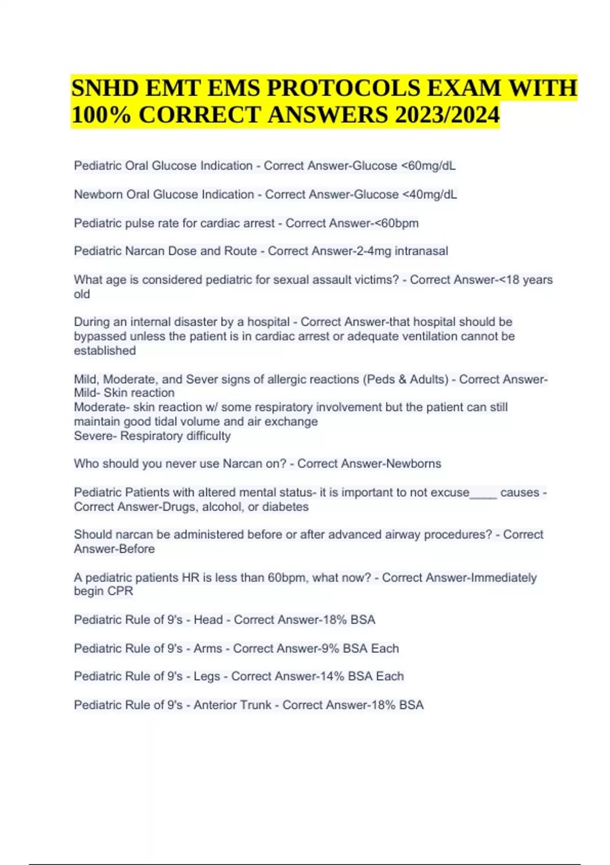 SNHD EMT EMS PROTOCOLS EXAM Questions and Answers 2023/2024 (100% Correct). Newborn Oral Glucose Indication - Correct Answer-Glucose <40mg/dL Pediatric pulse rate for cardiac arrest - Correct Answer-<60bpm Pediatric Narcan Dose and Route - Correct Answer-2-4mg intranasal What age is considered pediatric for sexual assault victims? - Correct Answer-<18 years old During an internal disaster by a hospital - Correct Answer-that hospital should be bypassed unless the patient is in cardiac arrest or adequate ventilation cannot be established Mild, Moderate, and Sever signs of allergic reactions (Peds & Adults) - Correct AnswerMild- Skin reaction Moderate- skin reaction w/ some respiratory involvement but the patient can still maintain good tidal volume and air exchange Severe- Respiratory difficulty Who should you never use Narcan on? - Correct Answer-Newborns Pediatric Patients with altered mental status- it is important to not excuse____ causes - Correct Answer-Drugs, alcohol, or diabetes Should narcan be administered before or after advanced airway procedures? - Correct Answer-Before A pediatric patients HR is less than 60bpm, what now? - Correct Answer-Immediately begin CPR Pediatric Rule of 9's - Head - Correct Answer-18% BSA Pediatric Rule of 9's - Arms - Correct Answer-9% BSA Each Pediatric Rule of 9's - Legs - Correct Answer-14% BSA Each Pediatric Rule of 9's - Anterior Trunk - Correct Answer-18% BSA SNHD EMT EMS PROTOCOLS EXAM WITH 100% CORRECT ANSWERS 2023/2024 Pediatric Rule of 9's - Posterior Trunk - Correct Answer-18% BSA Pediatric Rule of 9's - Groin - Correct Answer-1% BSA Life resuscitating treatment includes - Correct Answer-Chest compressions Defibrillation Assisted ventilations Prior to transfer who is responsible for notifying the reciveiving staff of reason, patient condition, and ETA? - Correct Answer-The physician to the receiving physician Criteria a patient must meet in order to be transported to a drug and alcohol rehab facility (vs an emergency room) - Correct Answer-BP: 90-180/60-100 Pulse: 60-120 Respiratory Rate: 12-22 Blood Glucose: 60-250 GCS: >14 Spo2: >94% or >90% for a smoker No Medical Complications No signs of trauma No suspected head trauma Approval of physican or mediacal staff prior to transport When resuscitation efforts are terminated what should you do with medical interventions? - Correct Answer-leave them in place When can you transport or move a body w/o permission from the coroners office? - Correct Answer-Never Indication for manual cervical stabilization - Correct Answer-Midline cervical tenderness Focal neurologic deficit AMS Drug or alcohol intoxication Painful or distracting injury Contraindications of manual cervical stabilization - Correct Answer--Penetrating trauma to head or neck w no evidence of spinal injury -When cervical collar might impede the patient's airway or ventilation - Patient in cardiac arrest Where to apply tourniquet - Correct Answer-proximal to injury site Contraindications to a traction splint - Correct Answer-Pelvic fracture/instability, knee, lower leg, or ankle instability What medications can an EMT-B administer for an uncontrolled nose bleed? (Medication, dose, and route) - Correct Answer-Oxymetazoline or Phenylephrine, 2 sprays per nostril, Intranasal How to evaluate posterior blood loss? (Epistaxis) - Correct Answer-Examine the posterior pharnyx At what point does sweat generally disappear? (Body temp) - Correct Answer-104 degrees F Any pregnant patient should be placed in what position? - Correct Answer-left lateral recumbent What medication, dose and route is used to treat a suspected opiate overdose? - Correct Answer-Narcan, 2-4mg, intranasal Waiting Room Criteria Blood Pressure - Correct Answer-100-180 Systolic 60-100 Diastolic Waiting Room Criteria HR & RR - Correct Answer-60-100 HR 10-20 RR Waiting Criteria Pulse Oximetry - Correct Answer->94% Waiting Room Criteria AxO - Correct Answer-x4 Important notes for stoke documentation - Correct Answer-Last known time of normal & a witness name and number if available