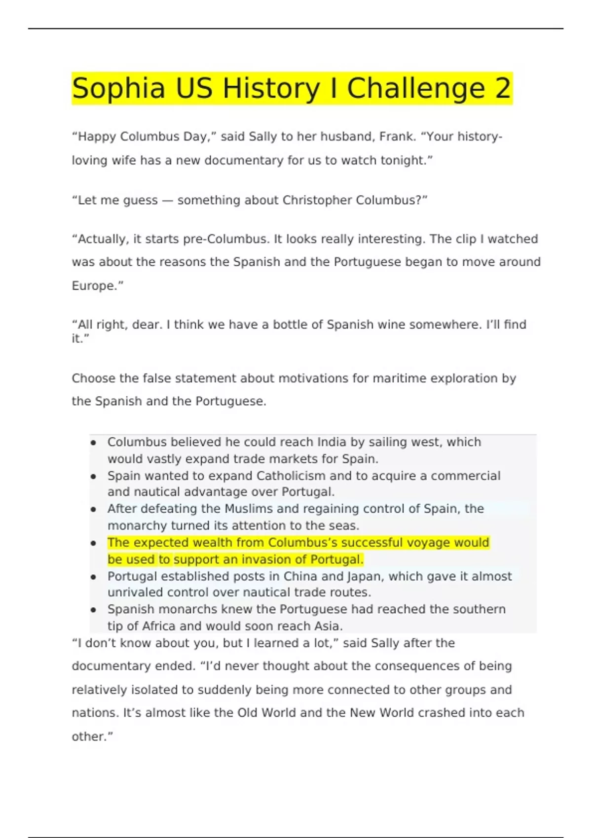 Summary SOPHIA US HISTORY 1 CHALLENGE 2 CORRECTLY ANSWERED /LATEST UPDATE VERSION/ GRADED A+