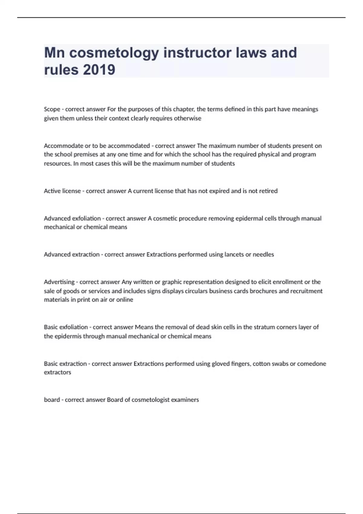 Mn cosmetology instructor laws and rules 2019 Scope - correct answer For the purposes of this chapter, the terms defined in this part have meanings given them unless their context clearly requires otherwise Accommodate or to be accommodated - correct answer The maximum number of students present on the school premises at any one time and for which the school has the required physical and program resources. In most cases this will be the maximum number of students Active license - correct answer A current license that has not expired and is not retired Advanced exfoliation - correct answer A cosmetic procedure removing epidermal cells through manual mechanical or chemical means Advanced extraction - correct answer Extractions performed using lancets or needles Advertising - correct answer Any written or graphic representation designed to elicit enrollment or the sale of goods or services and includes signs displays circulars business cards brochures and recruitment materials in print on air or online Basic exfoliation - correct answer Means the removal of dead skin cells in the stratum corners layer of the epidermis through manual mechanical or chemical means Basic extraction - correct answer Extractions performed using gloved fingers, cotton swabs or comedone extractors board - correct answer Board of cosmetologist examiners Free from all soil dirt and debris and washed with soap and water or a cleaning agent and then rinsed means to.... - correct answer Clean The portion of a cosmetology school where cosmetology services performed by students are offered to the public for compensation - correct answer Clinic Monetary or non monetary remuneration for services - correct answer Compensation The use of an anti microbial pesticide that eliminates harmful bacteria fungi and viruses on non porous surfaces - correct answer Disinfect Disinfectant - correct answer An anti microbial pesticide that is registered with the epa for use in a hospital setting and is bactericide, virucide, and fungicide Dispensary - correct answer A physical location or area in a salon or school where products chemals and disinfectants are prepared, measured mixed portioned or disposed of and where tools and implements are cleaned and disinfected or sterilized Dcumentation - correct answer A signed notarized statement attesting the truth of the facts stated in it Electrical energy treatments - correct answer Advanced practice esthetic services for the cosmetic care of the skin that use electrical energy as applied by skin care equipment used on the epidermal layer. Electrical energy treatments use light, direct current, indirect current, or sound energy, but do not include laser as identified in minnesota statutes Evidence - correct answer Written proof Extraction - correct answer Cosmetic technique of removing impactions and comedones from follicles Good repair - correct answer Item is clean with no holes frayed wires or tears in coverings and fully operational for the purpose intended