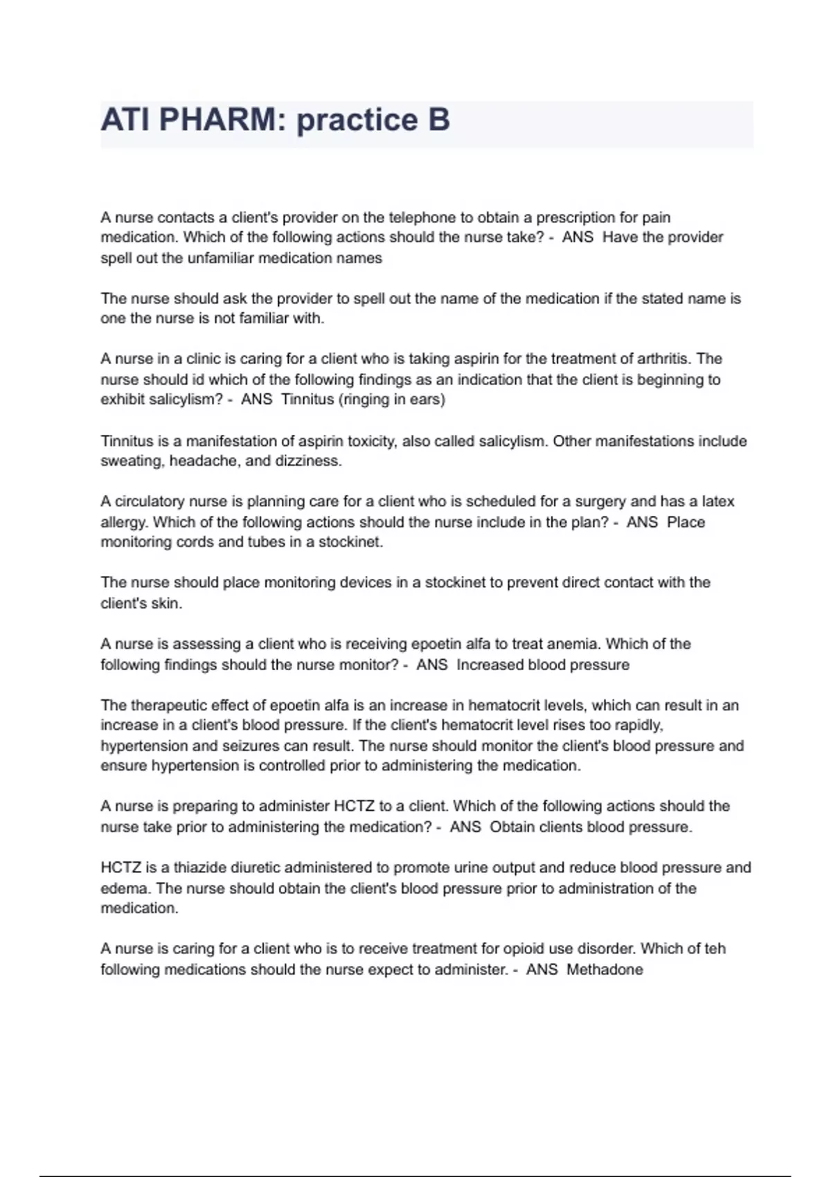 ATI PHARM: practice B Exam Questions And Answers All Verified A nurse contacts a client's provider on the telephone to obtain a prescription for pain medication. Which of the following actions should the nurse take? - ANS Have the provider spell out the unfamiliar medication names The nurse should ask the provider to spell out the name of the medication if the stated name is one the nurse is not familiar with. A nurse in a clinic is caring for a client who is taking aspirin for the treatment of arthritis. The nurse should id which of the following findings as an indication that the client is beginning to exhibit salicylism? - ANS Tinnitus (ringing in ears) Tinnitus is a manifestation of aspirin toxicity, also called salicylism. Other manifestations include sweating, headache, and dizziness. A circulatory nurse is planning care for a client who is scheduled for a surgery and has a latex allergy. Which of the following actions should the nurse include in the plan? - ANS Place monitoring cords and tubes in a stockinet. The nurse should place monitoring devices in a stockinet to prevent direct contact with the client's skin. A nurse is assessing a client who is receiving epoetin alfa to treat anemia. Which of the following findings should the nurse monitor? - ANS Increased blood pressure The therapeutic effect of epoetin alfa is an increase in hematocrit levels, which can result in an increase in a client's blood pressure. If the client's hematocrit level rises too rapidly, hypertension and seizures can result. The nurse should monitor the client's blood pressure and ensure hypertension is controlled prior to administering the medication. A nurse is preparing to administer HCTZ to a client. Which of the following actions should the nurse take prior to administering the medication? - ANS Obtain clients blood pressure. HCTZ is a thiazide diuretic administered to promote urine output and reduce blood pressure and edema. The nurse should obtain the client's blood pressure prior to administration of the medication. A nurse is caring for a client who is to receive treatment for opioid use disorder. Which of teh following medications should the nurse expect to administer. - ANS Methadone The nurse should expect to administer methadone for treatment of opioid use disorder. Methadone can be administered for withdrawal and to assist with maintenance and suppressive therapy. A nurse contacts a client's provider on the telephone to obtain a prescription for pain medication. Which of the following actions should the nurse take? - ANS Have the provider spell out the unfamiliar medication names The nurse should ask the provider to spell out the name of the medication if the stated name is one the nurse is not familiar with. A nurse in a clinic is caring for a client who is taking aspirin for the treatment of arthritis. The nurse should id which of the following findings as an indication that the client is beginning to exhibit salicylism? - ANS Tinnitus (ringing in ears) Tinnitus is a manifestation of aspirin toxicity, also called salicylism. Other manifestations include sweating, headache, and dizziness. A circulatory nurse is planning care for a client who is scheduled for a surgery and has a latex allergy. Which of the following actions should the nurse include in the plan? - ANS Place monitoring cords and tubes in a stockinet. The nurse should place monitoring devices in a stockinet to prevent direct contact with the client's skin. A nurse is assessing a client who is receiving epoetin alfa to treat anemia. Which of the following findings should the nurse monitor? - ANS Increased blood pressure The therapeutic effect of epoetin alfa is an increase in hematocrit levels, which can result in an increase in a client's blood pressure. If the client's hematocrit level rises too rapidly, hypertension and seizures can result. The nurse should monitor the client's blood pressure and ensure hypertension is controlled prior to administering the medication. A nurse is preparing to administer HCTZ to a client. Which of the following actions should the nurse take prior to administering the medication? - ANS Obtain clients blood pressure. HCTZ is a thiazide diuretic administered to promote urine output and reduce blood pressure and edema. The nurse should obtain the client's blood pressure prior to administration of the medication. A nurse is caring for a client who is to receive treatment for opioid use disorder. Which of teh following medications should the nurse expect to administer. - ANS Methadone The nurse should expect to administer methadone for treatment of opioid use disorder. Methadone can be administered for withdrawal and to assist with maintenance and suppressive therapy.