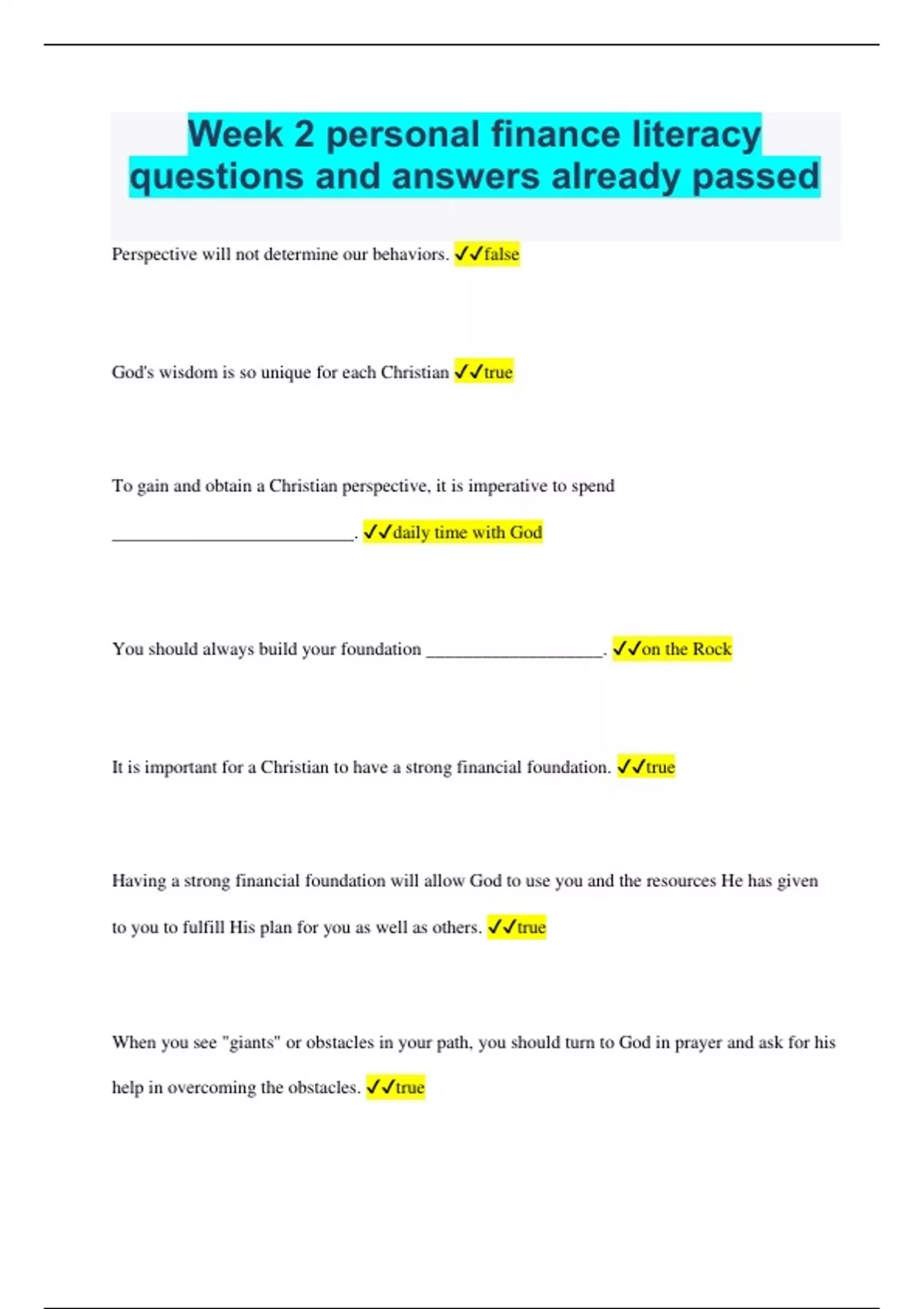 Week 2 personal finance literacy questions and answers already passed Perspective will not determine our behaviors. false God's wisdom is so unique for each Christian true To gain and obtain a Christian perspective, it is imperative to spend __________________________. daily time with God You should always build your foundation ___________________. on the Rock It is important for a Christian to have a strong financial foundation. true Having a strong financial foundation will allow God to use you and the resources He has given to you to fulfill His plan for you as well as others. true When you see "giants" or obstacles in your path, you should turn to God in prayer and ask for his help in overcoming the obstacles. true Spend less than we __________________. earn Avoid _________________. debt ___________________ generously. give Set _______________________ goals. long term Maintain ______________________. margin or savings In the lesson, you were given the following scenario: Luke has earned $250.00 with his part-time job. Once he made his tithe and paid his bills, he had $50.00 remaining with his money. Unfortunately, on the day that he got paid, his video game controllers stopped working correctly. Luke knew the cost would be about $75.00 to replace both of the controllers. He thought about the remaining amount that he had until his next paycheck which was $50.00. He thought about asking his parents to give him $25.00 so he would have the needed to buy new controllers. Which principle does this scenario align most closely to? Spend less than you earn In the lesson, you were given the following scenario: Leah had learned the keys to financial peace by following the five wise money principles. She had gotten the opportunity to go on a trip with her cousins to Florida. She was excited about the fun that she would have on the vacation and very happy that she was not in debt. Leah's cousins decided to ride together on the vacation and Leah had offered to drive her car. Unfortunately, on the way to Florida, Leah had a flat tire. Thankfully, everyone was safe and a nice, a Christian repair company came out to change Leah's tire. The repair cost for the new tire was $220.00. Leah was able to pay for the expense, too, without going in debt. An unexpected event had occurred, but Leah was prepared. Which principle does this scenario align most closely to? Maintain margin (Savings) The meaning of the phrase "debt mortgages your future" is that you can't use a part of your money now because you owe money to pay the debt in the future. true Being a steward implies that ________. you are not the authority about how resources are used God's Word teaches us to ________. all of the above The pie diagram reveals that there is no such thing as an __________________ financial decision. independent The pie diagram reveals that _____________. A and B The categories to "Owe" in the pie diagram are paying taxes, paying debts, and paying our tithe. false In Matthew 22:21, Jesus told the Jews not to pay taxes because they were God's chosen people. false Putting your money in an interest checking account would be an example of the "Grow" slice of the pie. true Money as a tool can be used to: all of the above Hebrews 13:5 tells us to keep our lives free from the love of money and to be _________________ with what you have. content There are four main categories shown in the Pie diagram. The first three are Live, Give, and Owe. Type in the name of the fourth category. grow What are the two subcategories of Owe? owe taxes, owe debt Jesus told his disciples not to pay taxes to Caesar. false Luke 16:13 states that "No servant can serve two masters. Either he will hate the one and love the other, or he will be devoted to the one and despise the other. You cannot serve both God and _________________." money What you spend your money on is a good indicator of where your heart is. true In the parable of the rich fool, God commended him for being a faithful steward. false In the story of the widow and her offering, Jesus was impressed with the widow because she _______________________________. gave all that she had Jesus said the widow gave "all she had." What percentage of her money did she give? 100% According to 1 Timothy 6:10, Paul is saying that money is evil. false Select the answer that shows how giving breaks the power of money in your life. Giving money away keeps you in control of your money instead of being controlled by it.