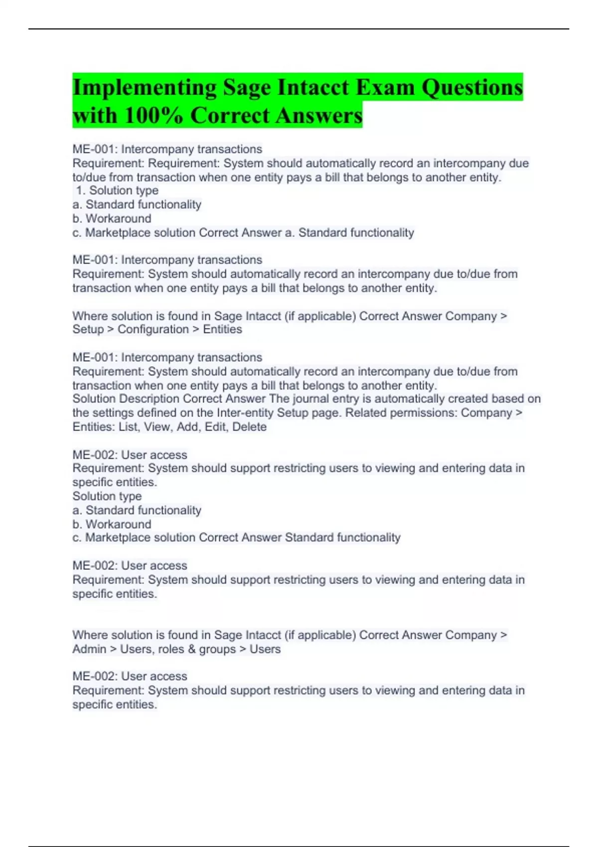 ME-001: Intercompany transactions Requirement: Requirement: System should automatically record an intercompany due to/due from transaction when one entity pays a bill that belongs to another entity. 1. Solution type a. Standard functionality b. Workaround c. Marketplace solution Correct Answer a. Standard functionality ME-001: Intercompany transactions Requirement: System should automatically record an intercompany due to/due from transaction when one entity pays a bill that belongs to another entity. Where solution is found in Sage Intacct (if applicable) Correct Answer Company > Setup > Configuration > Entities ME-001: Intercompany transactions Requirement: System should automatically record an intercompany due to/due from transaction when one entity pays a bill that belongs to another entity. Solution Description Correct Answer The journal entry is automatically created based on the settings defined on the Inter-entity Setup page. Related permissions: Company > Entities: List, View, Add, Edit, Delete ME-002: User access Requirement: System should support restricting users to viewing and entering data in specific entities. Solution type a. Standard functionality b. Workaround c. Marketplace solution Correct Answer Standard functionality ME-002: User access Requirement: System should support restricting users to viewing and entering data in specific entities. Where solution is found in Sage Intacct (if applicable) Correct Answer Company > Admin > Users, roles & groups > Users ME-002: User access Requirement: System should support restricting users to viewing and entering data in specific entities. Solution Description Correct Answer On the User Entity tab, users can be restricted to only access and record data for specific entities. Related permissions: Administrative Permissions > Users: List, View, Add, Edit, Delete, Permissions GL-001: Accounts Requirements: System should allow specific users to create, edit, and delete General Ledger accounts. Solution type a. Standard functionality b. Workaround c. Marketplace solution Correct Answer a. Standard functionali GL-001: Accounts Requirements: System should allow specific users to create, edit, and delete General Ledger accounts. Where solution is found in Sage Intacct (if applicable) Correct Answer General Ledger > All > Accounts > General Ledger Accounts GL-001: Accounts Requirements: System should allow specific users to create, edit, and delete General Ledger accounts. Solution Description Correct Answer No configuration needed. Related permissions: Journal Entries: Reverse GL-002: Accounts Requirement: System should support recording non-monetary numeric transactions, such as employee headcount and square footage. Solution type a. Standard functionality b. Workaround c. Marketplace solution Correct Answer Standard functionality GL-002: Accounts Requirement: System should support recording non-monetary numeric transactions, such as employee headcount and square footage. Where solution is found in Sage Intacct (if applicable) Correct Answer General Ledger > All > Accounts > Statistical accounts GL-002: Accounts Requirement: System should support recording non-monetary numeric transactions, such as employee headcount and square footage.