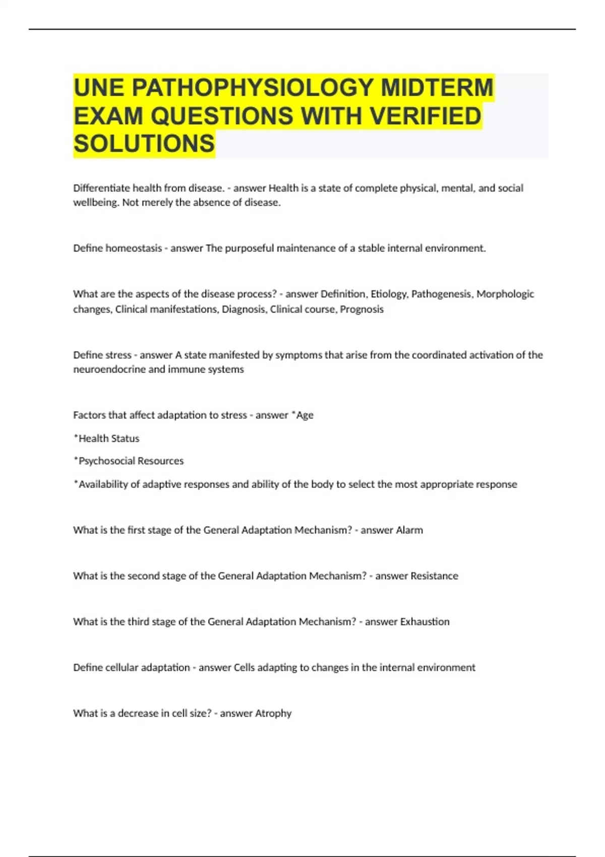 UNE PATHOPHYSIOLOGY MIDTERM EXAM QUESTIONS WITH VERIFIED SOLUTIONS
