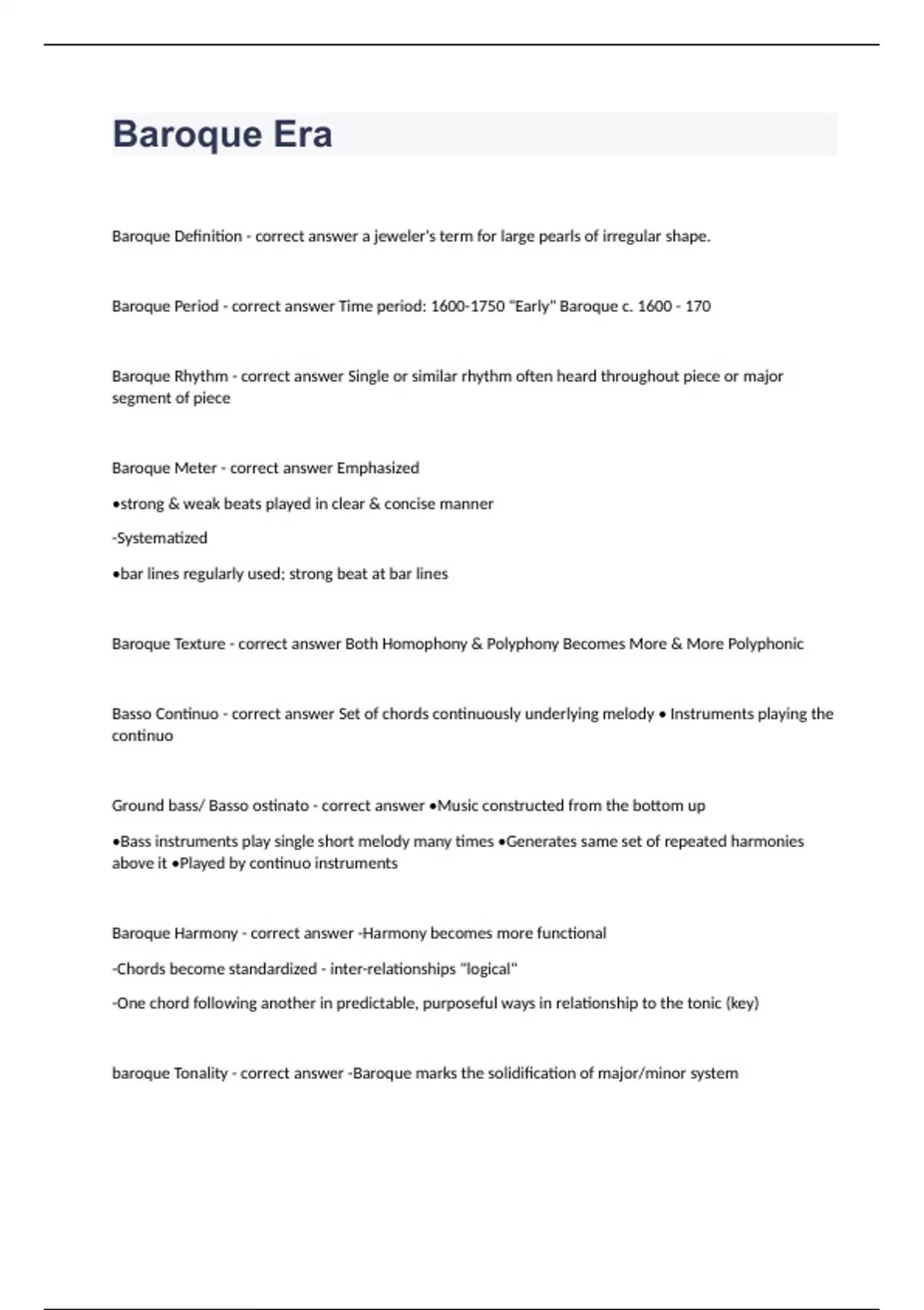 Baroque Era Baroque Definition - correct answer a jeweler's term for large pearls of irregular shape. Baroque Period - correct answer Time period: "Early" Baroque c. 1600 - 170 Baroque Rhythm - correct answer Single or similar rhythm often heard throughout piece or major segment of piece Baroque Meter - correct answer Emphasized •strong & weak beats played in clear & concise manner -Systematized •bar lines regularly used; strong beat at bar lines Baroque Texture - correct answer Both Homophony & Polyphony Becomes More & More Polyphonic Basso Continuo - correct answer Set of chords continuously underlying melody • Instruments playing the continuo Ground bass/ Basso ostinato - correct answer •Music constructed from the bottom up •Bass instruments play single short melody many times •Generates same set of repeated harmonies above it •Played by continuo instruments Baroque Harmony - correct answer -Harmony becomes more functional -Chords become standardized - inter-relationships "logical" -One chord following another in predictable, purposeful ways in relationship to the tonic (key) baroque Tonality - correct answer -Baroque marks the solidification of major/minor system MOTET DEFINITION - correct answer •A genre •From French word mot - meaning "word" MOTET CHARACTERISTICS - correct answer •Sacred •Focus on voices -Can contain instrumental parts •Both music (melody & harmony) and words can change EARLY BAROQUE OPERA DEFINITION - correct answer Drama presented to music EARLY BAROQUE OPERA RECITATIVE - correct answer • Declaiming words musically in a heightened theatrical manner • Instrumental accompaniment kept to minimum • Used to relate information, for plot action, dialogue EARLY BAROQUE OPERA ARIA - correct answer • More melodic, rhythm is more consistent, meter clearer • Entire orchestra accompanies • Used to show emotion, feelings, what's going on in mind of singer GIOVANNI GABRIELI - correct answer c. Organist at St. Mark's Basilica Catholic cathedral in Venice, Italy CLAUDIO MONTEVERDI - correct answer • • Music "superstar" from 1607 till death • Spans genres - "last great madrigalist" - "first great opera composer" • Court of Mantua () • St. Mark's Cathedral in Venice () • Operas: