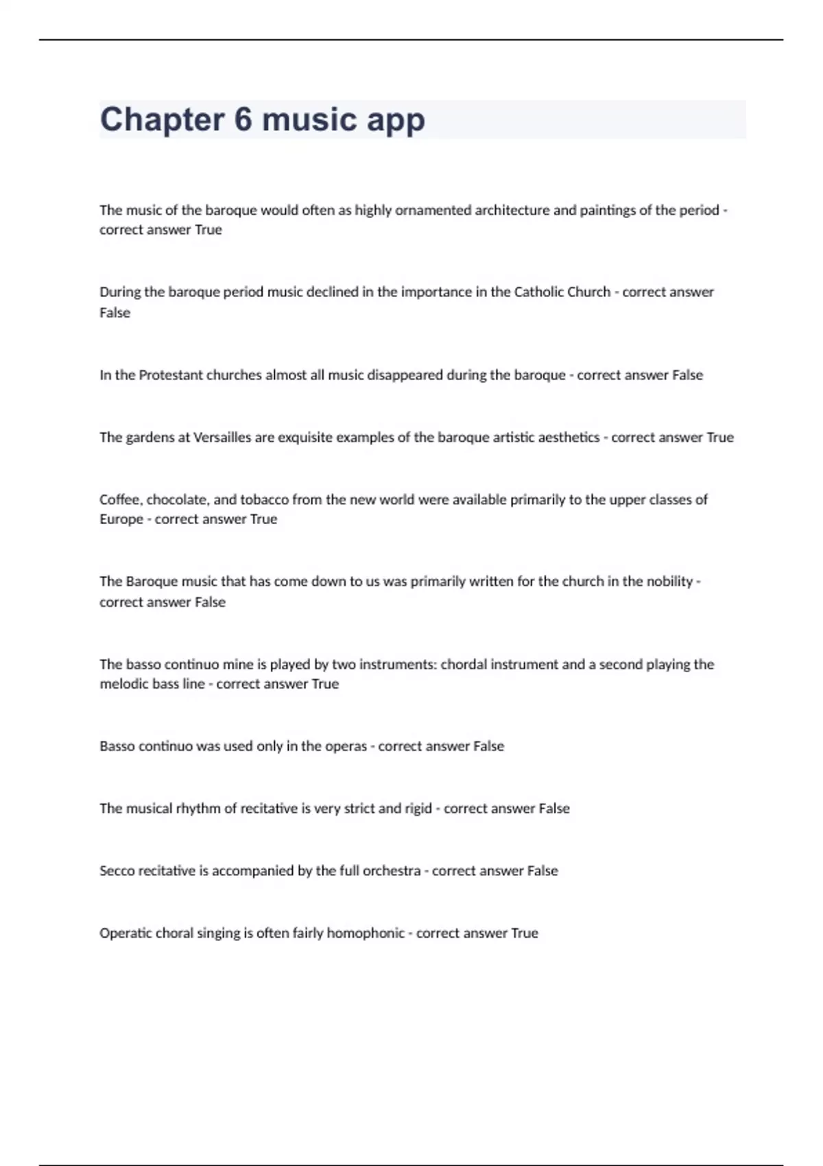 Chapter 6 music appThe music of the baroque would often as highly ornamented architecture and paintings of the period - correct answer True During the baroque period music declined in the importance in the Catholic Church - correct answer False In the Protestant churches almost all music disappeared during the baroque - correct answer False The gardens at Versailles are exquisite examples of the baroque artistic aesthetics - correct answer True Coffee, chocolate, and tobacco from the new world were available primarily to the upper classes of Europe - correct answer True The Baroque music that has come down to us was primarily written for the church in the nobility - correct answer False The basso continuo mine is played by two instruments: chordal instrument and a second playing the melodic bass line - correct answer True Basso continuo was used only in the operas - correct answer False The musical rhythm of recitative is very strict and rigid - correct answer False Secco recitative is accompanied by the full orchestra - correct answer False Operatic choral singing is often fairly homophonic - correct answer True Peri and Monteverdi composed operas based on the same object-the story of Orpheus - correct answer True The baroque opera was rarely based on Greek legends - correct answer False Francesca Caccini was an opera singer and composer at the court of the Medici family - correct answer True Heroic male roles in the baroque opera were often sung by castrati - correct answer True Today women frequently sing castrato roles - correct answer True Purcell's Dido and Aeneas marks the beginning of opera as a major art form - correct answer False The earliest public opera houses were built by 1637 - correct answer True Though many composers, such as Handel, composed opera, it never really became popular outside of Italy - correct answer False French opera during the baroque period was essentially the same as Italian opera because the primary opera composer, Lully, was Italian - correct answer False Which city was the leader of the European culture and design by the 18th century - correct answer Paris The greatest baroque church musician was - correct answer Johann sebastian bach The group of musicians and scholars who invented opera while trying to recreate the spirit of Greek drama were the - correct answer Camerata Homophonic music that allows the singers voice to predominate - correct answer Monody