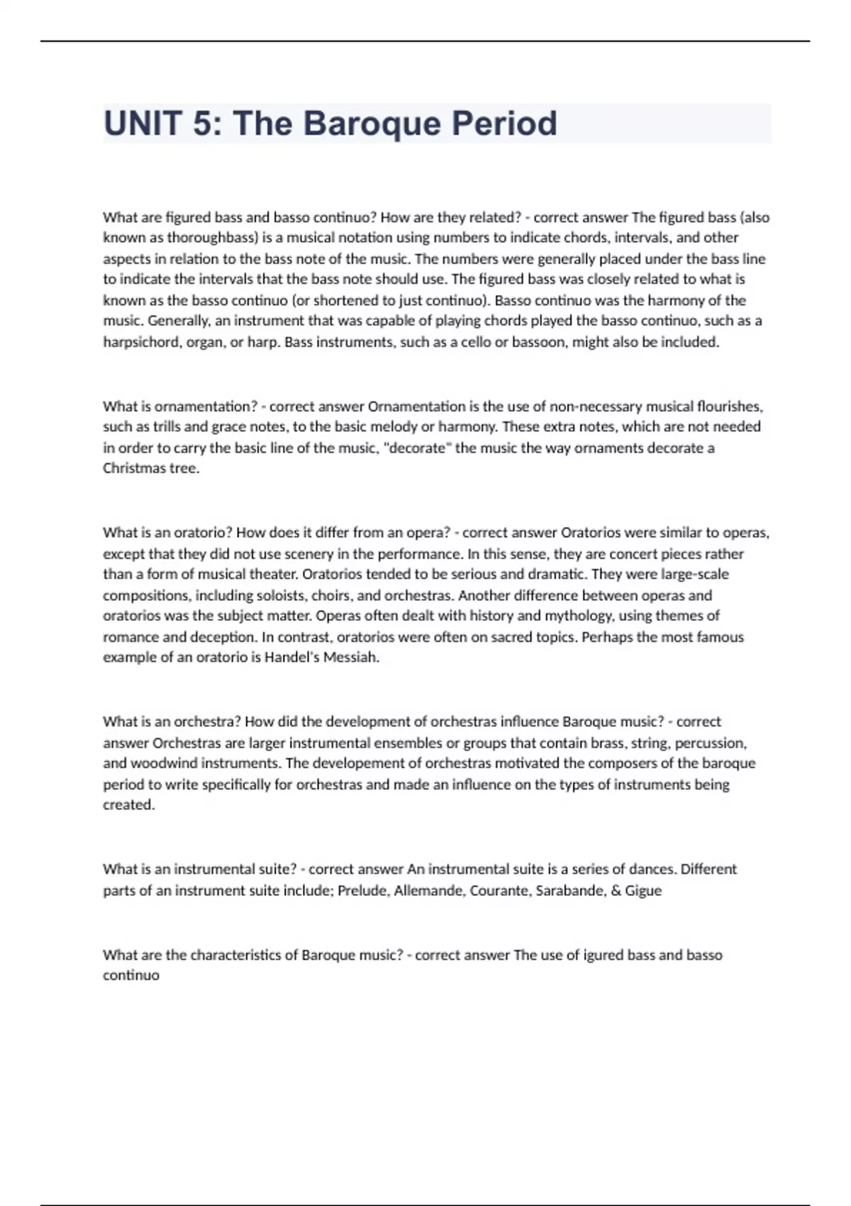 UNIT 5 The Baroque PeriodWhat are figured bass and basso continuo? How are they related? - correct answer The figured bass (also known as thoroughbass) is a musical notation using numbers to indicate chords, intervals, and other aspects in relation to the bass note of the music. The numbers were generally placed under the bass line to indicate the intervals that the bass note should use. The figured bass was closely related to what is known as the basso continuo (or shortened to just continuo). Basso continuo was the harmony of the music. Generally, an instrument that was capable of playing chords played the basso continuo, such as a harpsichord, organ, or harp. Bass instruments, such as a cello or bassoon, might also be included. What is ornamentation? - correct answer Ornamentation is the use of non-necessary musical flourishes, such as trills and grace notes, to the basic melody or harmony. These extra notes, which are not needed in order to carry the basic line of the music, "decorate" the music the way ornaments decorate a Christmas tree. What is an oratorio? How does it differ from an opera? - correct answer Oratorios were similar to operas, except that they did not use scenery in the performance. In this sense, they are concert pieces rather than a form of musical theater. Oratorios tended to be serious and dramatic. They were large-scale compositions, including soloists, choirs, and orchestras. Another difference between operas and oratorios was the subject matter. Operas often dealt with history and mythology, using themes of romance and deception. In contrast, oratorios were often on sacred topics. Perhaps the most famous example of an oratorio is Handel's Messiah. What is an orchestra? How did the development of orchestras influence Baroque music? - correct answer Orchestras are larger instrumental ensembles or groups that contain brass, string, percussion, and woodwind instruments. The developement of orchestras motivated the composers of the baroque period to write specifically for orchestras and made an influence on the types of instruments being created. What is an instrumental suite? - correct answer An instrumental suite is a series of dances. Different parts of an instrument suite include; Prelude, Allemande, Courante, Sarabande, & Gigue What are the characteristics of Baroque music? - correct answer The use of igured bass and basso continuo How did composers and musicians think about themselves during the Baroque period? How did this influence the music that they created? - correct answer Although we consider some of the music during this period to be artistic masterpieces today, composers and musicians during this time thought of themselves more as craftsmen than artists. They often made their living through patrons or individuals who supported them in exchange for their music. Patrons included not only the wealthy in society, but also the nobility and the church. The music of the period was often composed for specific circumstances, whether it was a party or a religious event. Some composers also worked as music tutors, composing easier compositions for their students. Vivaldi, for example, has a number of pieces that appear to be five-finger exercises composed for his students. Because of the deliberate and specific reasons for compositions, individual pieces were not generally thought of as great compositions that would be played over and over and have a lasting impact. Rather, they were thought of as situation specific, almost as disposable pieces of music. What were two major influences on German Baroque music? How did these factors influence the music? - correct answer Two major influences of German Baroque music were the German violin bow and the true chords that were often played. These factors influenced Back specifiably because they made his violin solo more interesting and more accurate. The Church and the Sate also influenced the Baroque music. How did music differ before and after Bach? - correct answer Before Bach's time, music had very little base, so no proper foundations (tonality, proper scoring etc.). But after Bach's time, he had made the harpsicord's abilities really stand out with his 48 Preludes and Fugues. After Bach's works, more modulations, techniques and variance of tonal centre were established. How have the performances of Baroque music changed (in terms of tempi, balance and timbre) from the Baroque period to today? - correct answer When compared to "classical" performances, modern performances of Baroque music typically use a slower tempi, a similar balance (although recording studios can disrupt the natural balance sometimes, by pushing the harpsichord into the background) and a flatter timbre due to the instruments used in modern times (different materials used) What is a Baroque spirit when playing music? - correct answer Having emotion that reflects the music you are playing Who was Arcangelo Corelli? What are some of his contributions to classical music? - correct answer Italian composer and violinist. He proved the potentialities of Concerto-Grosso principle. He wrote the first great music for Concerto-Grosso principle.