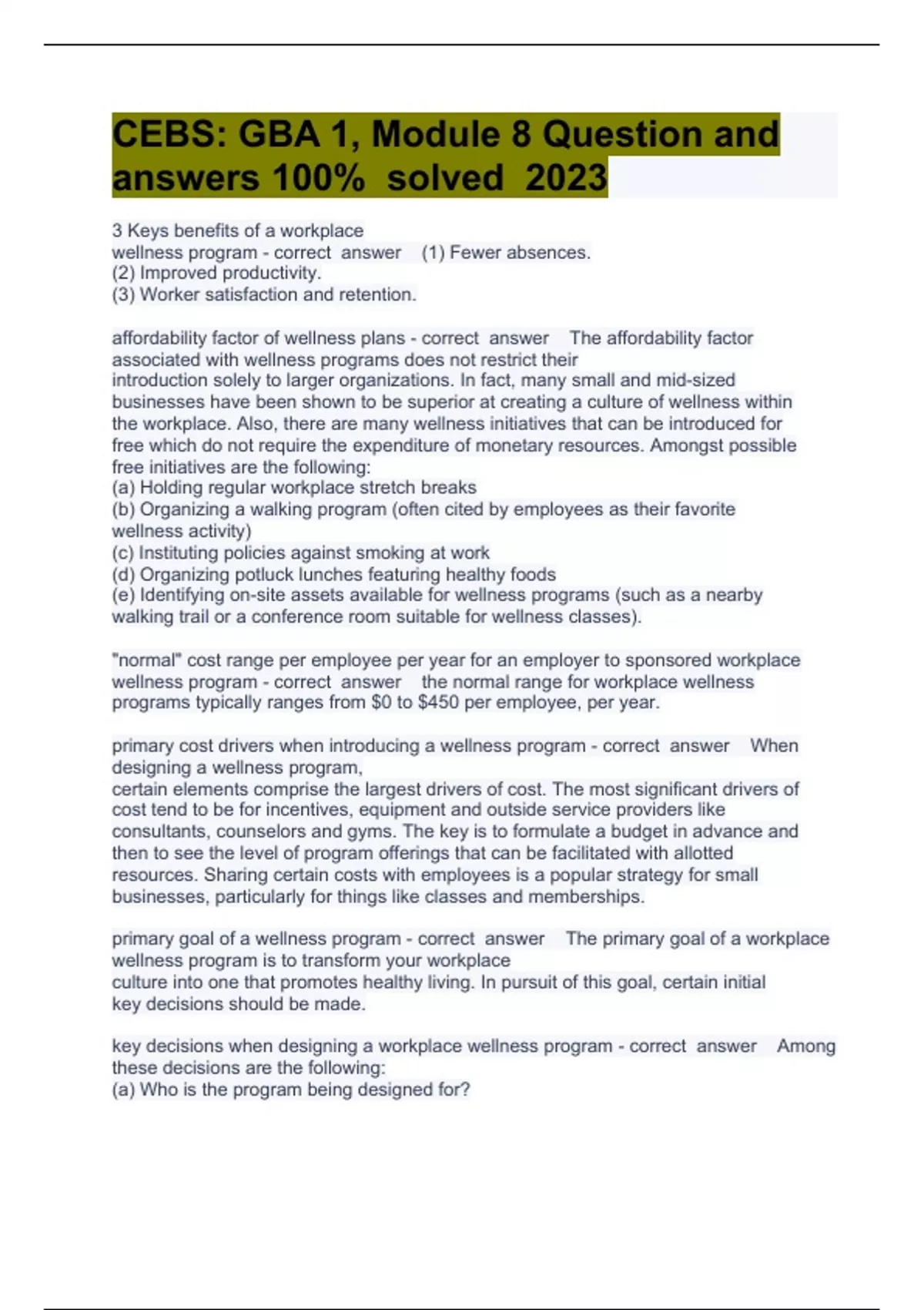 CEBS8 Question and answers rated A+ 2023/2024 3 Keys benefits of a workplace wellness program - correct answer (1) Fewer absences. (2) Improved productivity. (3) Worker satisfaction and retention. affordability factor of wellness plans - correct answer The affordability factor associated with wellness programs does not restrict their introduction solely to larger organizations. In fact, many small and mid-sized businesses have been shown to be superior at creating a culture of wellness within the workplace. Also, there are many wellness initiatives that can be introduced for free which do not require the expenditure of monetary resources. Amongst possible free initiatives are the following: (a) Holding regular workplac