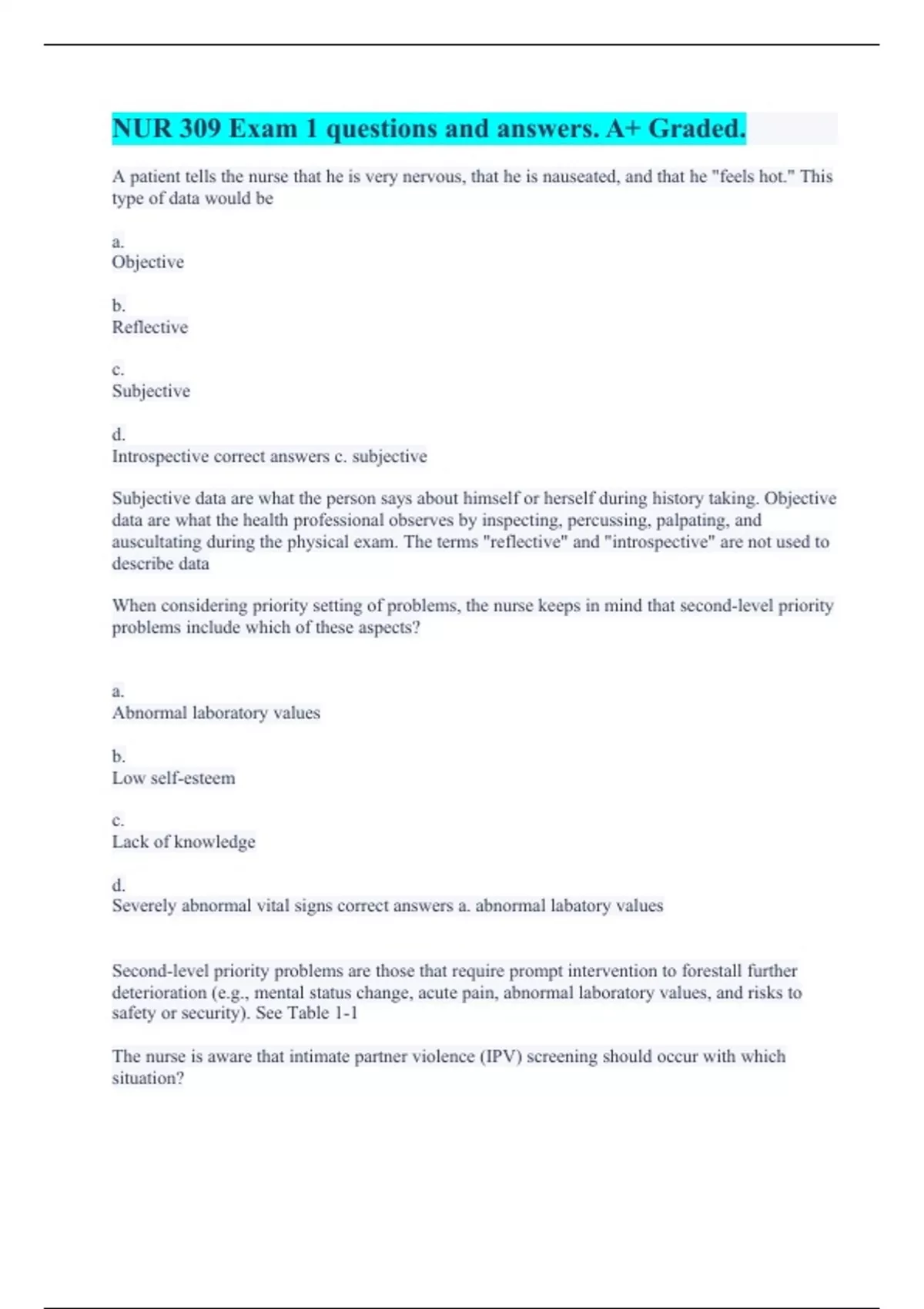 A patient tells the nurse that he is very nervous, that he is nauseated, and that he "feels hot." This type of data would be a. Objective b. Reflective c. Subjective d. Introspective correct answers c. subjective Subjective data are what the person says about himself or herself during history taking. Objective data are what the health professional observes by inspecting, percussing, palpating, and auscultating during the physical exam. The terms "reflective" and "introspective" are not used to describe data When considering priority setting of problems, the nurse keeps in mind that second-level priority problems include which of these aspects? a. Abnormal laboratory values b. Low self-esteem c. Lack of knowledge d. Severely abnormal vital signs correct answers a. abnormal labatory values Second-level priority problems are those that require prompt intervention to forestall further deterioration (e.g., mental status change, acute pain, abnormal laboratory values, and risks to safety or security). See Table 1-1 The nurse is aware that intimate partner violence (IPV) screening should occur with which situation?
