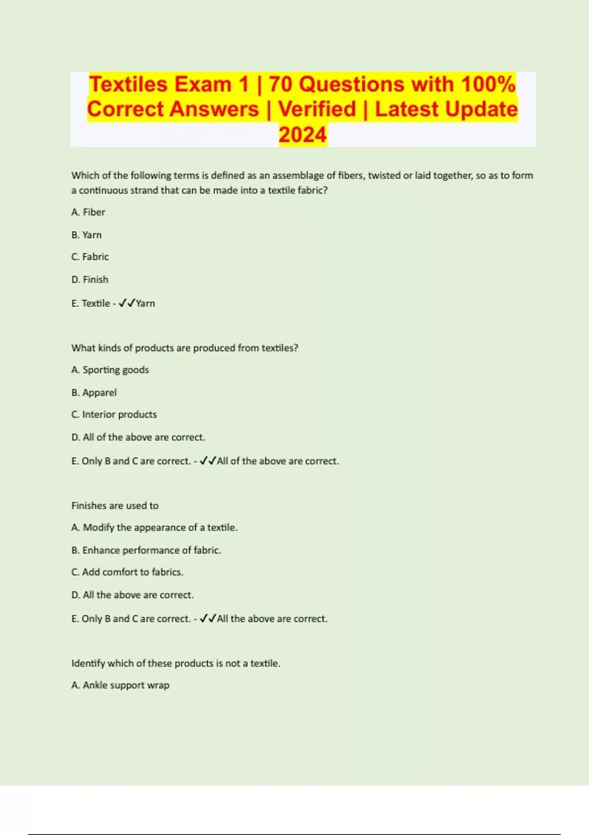 Textiles Exam 1 | 70 Questions with 100% Correct Answers | Verified | Latest Update 2024