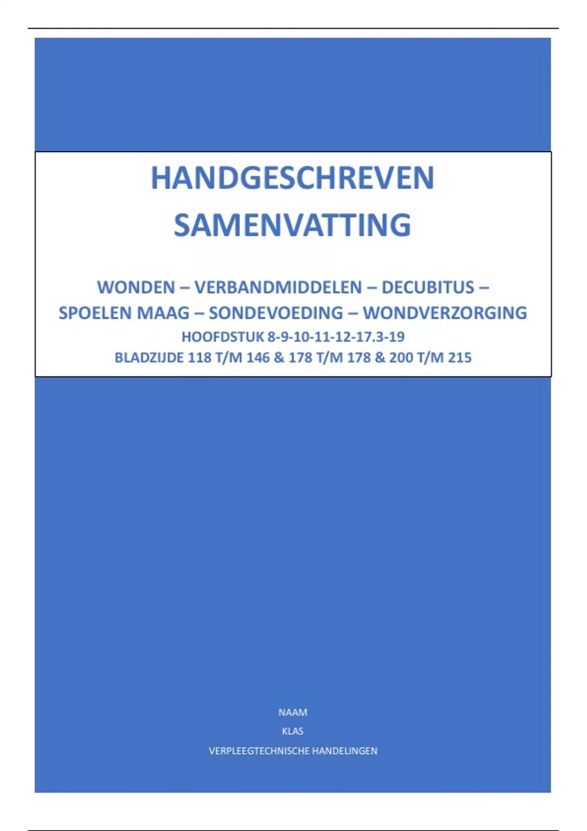 Handgeschreven samenvatting over wonden, wondgenezing, verzorgen van wonden, verbandmiddelen, decubitus, spoelen maag, sondevoeding. Het gaat hier om de hoofdstukken -17.3 en 19 met de pagina's 118 t/m 146, 175 t/m 178 en 200 t/m 215.