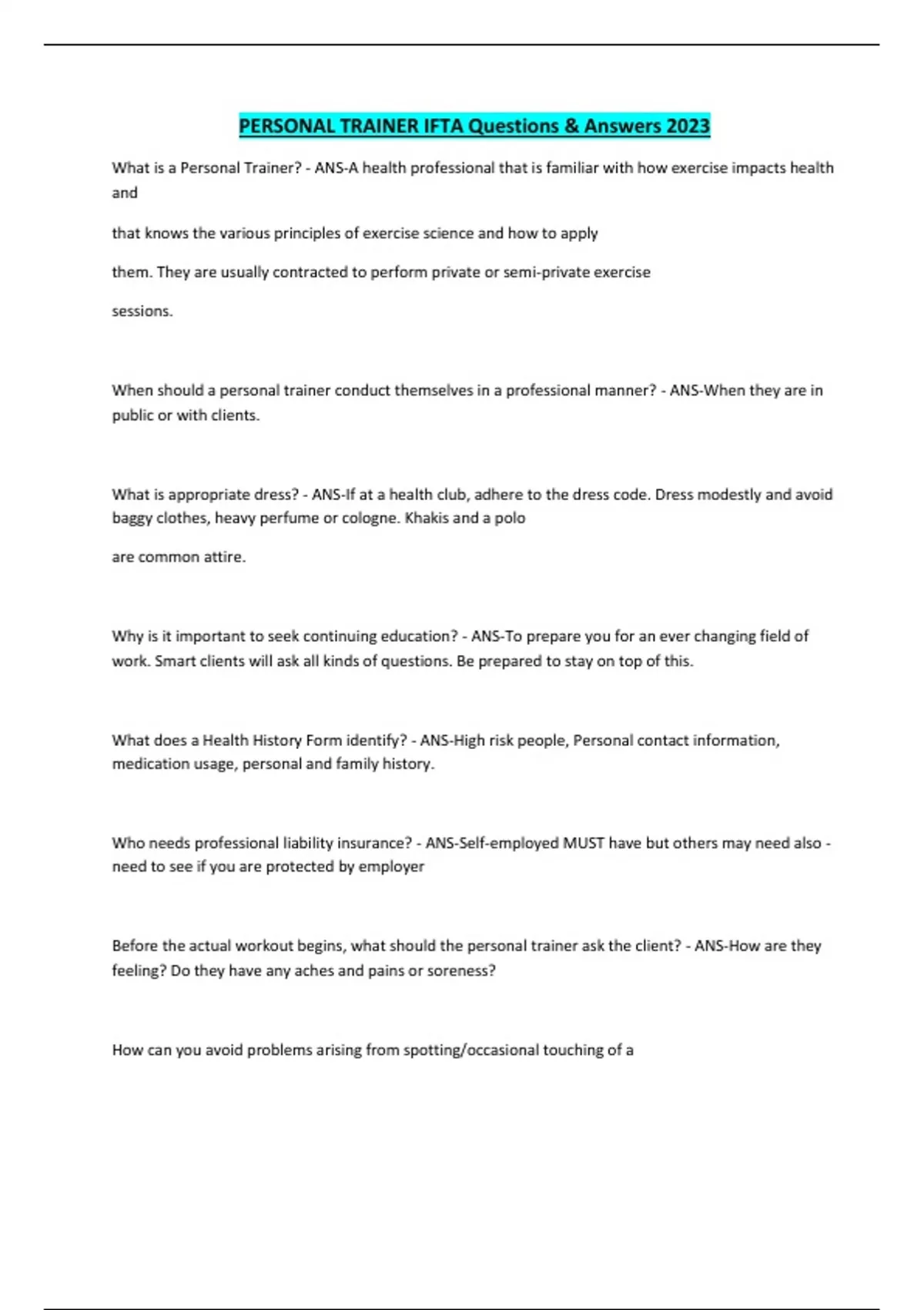 PERSONAL TRAINER IFTA Questions & Answers 2023 What is a Personal Trainer? - ANS-A health professional that is familiar with how exercise impacts health and that knows the various principles of exercise science and how to apply them. They are usually contracted to perform private or semi-private exercise sessions. When should a personal trainer conduct themselves in a professional manner? - ANS-When they are in public or with clients. What is appropriate dress? - ANS-If at a health club, adhere to the dress code. Dress modestly and avoid baggy clothes, heavy perfume or cologne. Khakis and a polo are common attire. Why is it important to seek continuing education? - ANS-To prepare you for an ever changing field of work. Smart clients will ask all kinds of questions. Be prepared to stay on top of this. What does a Health History Form identify? - ANS-High risk people, Personal contact information, medication usage, personal and family history. Who needs professional liability insurance? - ANS-Self-employed MUST have but others may need also - need to see if you are protected by employer Before the actual workout begins, what should the personal trainer ask the client? - ANS-How are they feeling? Do they have any aches and pains or soreness? How can you avoid problems arising from spotting/occasional touching of a client? - ANS-Explain the nature of spotting/occasional touching during the initial interview. During the session, always ask first if it is ok For the most part we are always burning a mixture of ---- and ---- to power our energy needs. - ANS-fat; sugar The ---- of activity dictates what we burn for fuel but also the actual -------- that we can do an activity. - ANS-intensity; length of time ---- exercise causes ---- to enlarge and to become more numerous. This allows for the burning of more fat. - ANS-Aerobic; mitochondria Aerobically trained muscles use what during exercise and the result is? - ANS-More fat and less glycogen so they can work longer...