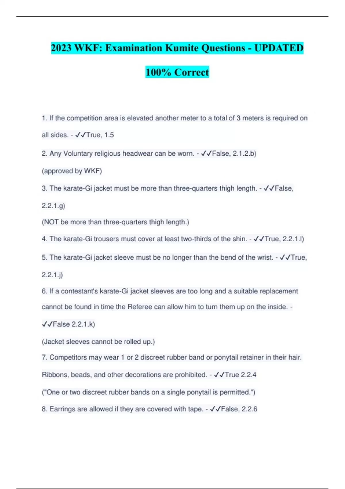 2023 WKF: Examination Kumite Questions - UPDATED 100% Correct 1. If the competition area is elevated another meter to a total of 3 meters is required on all sides. - ️️ True, 1.5 2. Any Voluntary religious headwear can be worn. - ️️ False, 2.1.2.b) (approved by WKF) 3. The karate-Gi jacket must be more than three-quarters thigh length. - ️️ False, 2.2.1.g) (NOT be more than three-quarters thigh length.) 4. The karate-Gi trousers must cover at least two-thirds of the shin. - ️️ True, 2.2.1.l) 5. The karate-Gi jacket sleeve must be no longer than the bend of the wrist. - ️️ True, 2.2.1.j) 6. If a contestant's karate-Gi jacket sleeves are too long and a suitable replacement cannot be found in time the Referee can allow him to turn them up on the inside. - ️️ False 2.2.1.k) (Jacket sleeves cannot be rolled up.) 7. Competitors may wear 1 or 2 discreet rubber band or ponytail retainer in their hair. Ribbons, beads, and other decorations are prohibited. - ️️ True 2.2.4 ("One or two discreet rubber bands on a single ponytail is permitted.") 8. Earrings are allowed if they are c