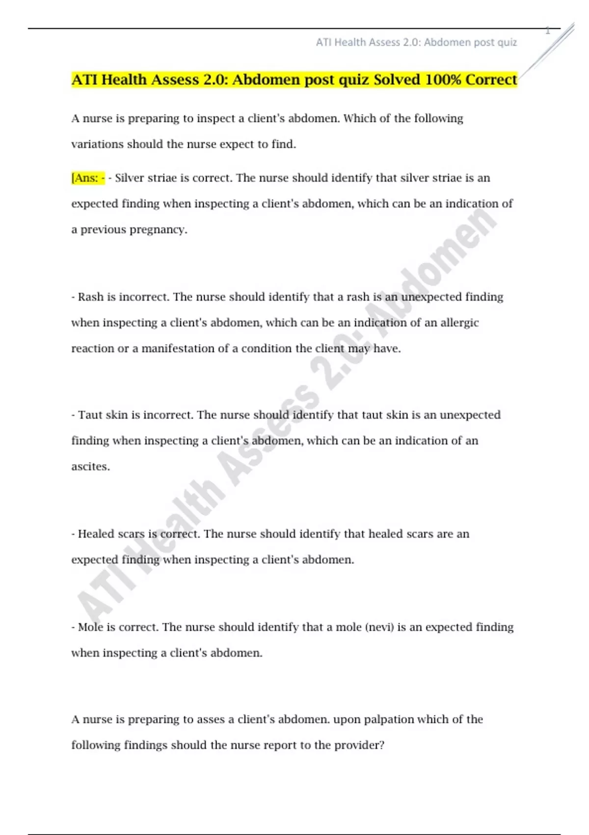 ATI Health Assess 2.0: Abdomen post quiz Solved 100% Correct,ATI Health Assess 2.0: Abdomen post quiz Solved 100% Correct,ATI Health Assess 2.0: Abdomen post quiz Solved 100% Correct