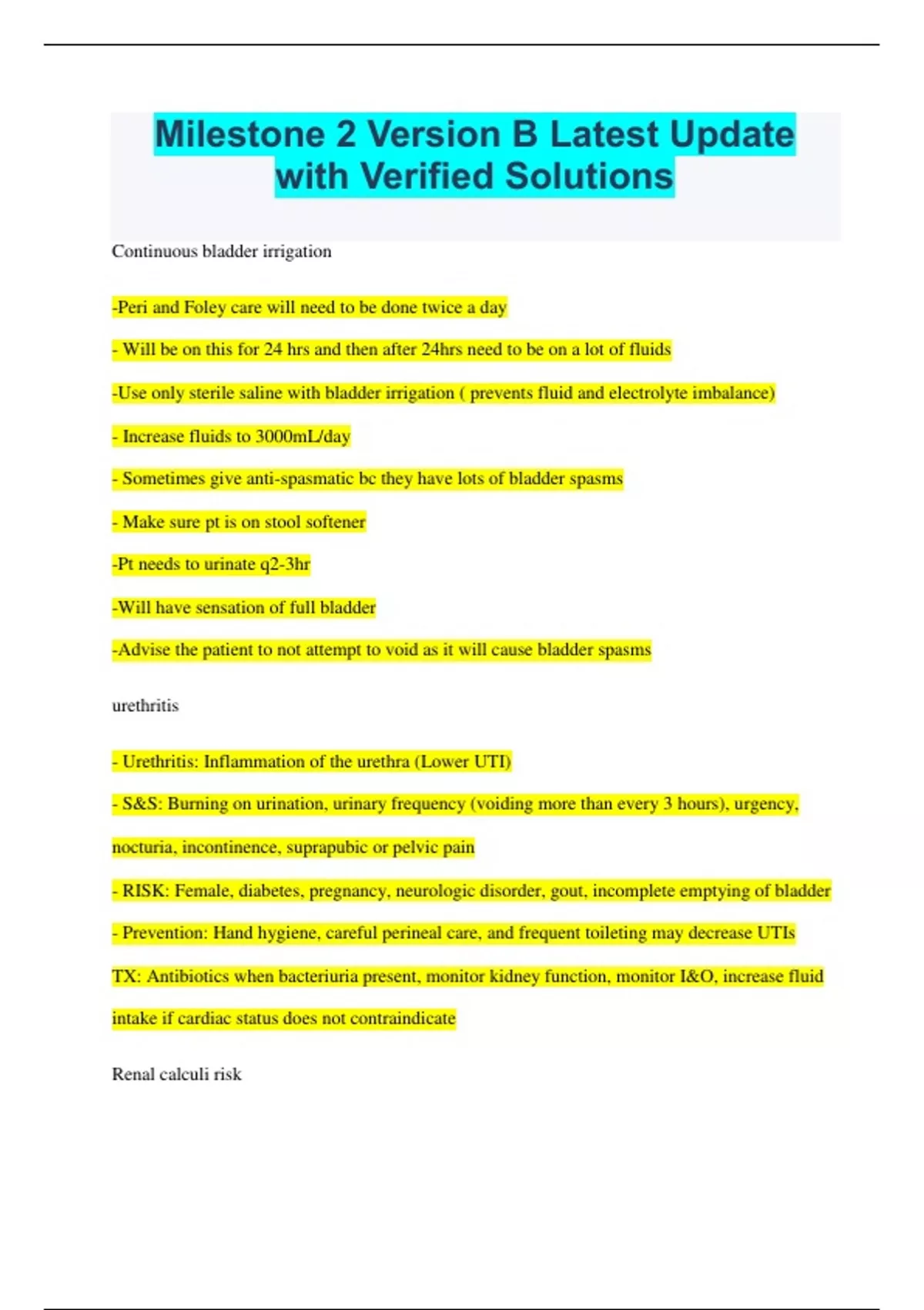 Milestone 2 Version B Latest Update with Verified Solutions Continuous bladder irrigation -Peri and Foley care will need to be done twice a day - Will be on this for 24 hrs and then after 24hrs need to be on a lot of fluids -Use only sterile saline with bladder irrigation ( prevents fluid and electrolyte imbalance) - Increase fluids to 3000mL/day - Sometimes give anti-spasmatic bc they have lots of bladder spasms - Make sure pt is on stool softener -Pt needs to urinate q2-3hr -Will have sensation of full bladder -Advise the patient to not attempt to void as it will cause bladder spasms urethritis - Urethritis: Inflammation of the urethra (Lower UTI) - S&S: Burning on urination, urinary frequency (voiding more than every 3 hours), urgency, nocturia, incontinence, suprapubic or pelvic pain - RISK: Female, diabetes, pregnancy, neurologic disorder, gout, incomplete emptying of bladder - Prevention: Hand hygiene, careful perineal care, and frequent toileting may decrease UTIs TX: Antibiotics when bacteriuria present, monitor kidney function, monitor I&O, increase fluid intake if cardiac status does not contraindicate Renal calculi risk Risk factors: - Family history, dehydration, certain diets (high in protein, sodium, and sugar increase risk), strictures, neoplasms, prostatic hypertrophy, medications/supplements (Vit C, laxatives, calcium-based antacids) Risks (emergency): - Can lead to infection with fever and chills à this is an emergency and can be life-threatening - Calcium and oxalate -Risk for developing kidney stone pt with gout (middle age) -Strain all urine -Avoid supine position -regularly scheduled pain medication rather then PRN to prevent spasm and promote comfort Calculi pain - Opioid are given to prevent shock and syncope that may result from the excruciating pain - NSAIDS - Once stone is passed the pain the relieved - Hot baths or moist heat to the flank area may also be helpful - S&S nausea, vomiting, diarrhea, and abdominal distention Severity and location of pain are determine, along with any radiation of pain Imitrex contraindications Imitrex (Sumatriptan) is used for migraine headaches with or without an aura (also used to treat cluster headaches) - Contraindications 1. Older adults should not take 2. Caution when administering to renal impaired patients because elimination takes place in the renal system 3. Caution with hepatic impaired patients because metabolism takes place in liver 4. History of hypersensitivity reactions to the drug 5. Cerebrovascular or peripheral vascular systems - Important to ask patient about recent administration ergot alkaloids, should not be given within 24 hours of administration (causes cardiac ischemia) - Administration of MAO inhibitors lead to increased serum levels of sumatriptan and sumatriptan toxicity - 2 weeks after MAO inhibitor has been discontinued, it is permissible to give sumatriptan in combination with MAO inhibitor - Administration of St. John's wort with triptans results in triptan toxicity. Seizures -Patient bed in the lowest position with side rails padded -Suction -Oxygen equipment must be available at the patient's bedside -Document -Airway patency turn patient head to side Hyperthyroidism signs/symptoms - Exophthalmos (bulging eyes) - Enlarger thyroid gland - Weight loss - T3 elevated and T4 elevated - Diarrhea - Tachycardic, palpitation, inc BP - Bruit over thyroid - Increased appetite - Heat intolerance - Diaphoresis - Nervous, insomnia - Monitor EKG, heart rate, and blood pressure Exophthalmos-POC - Wear