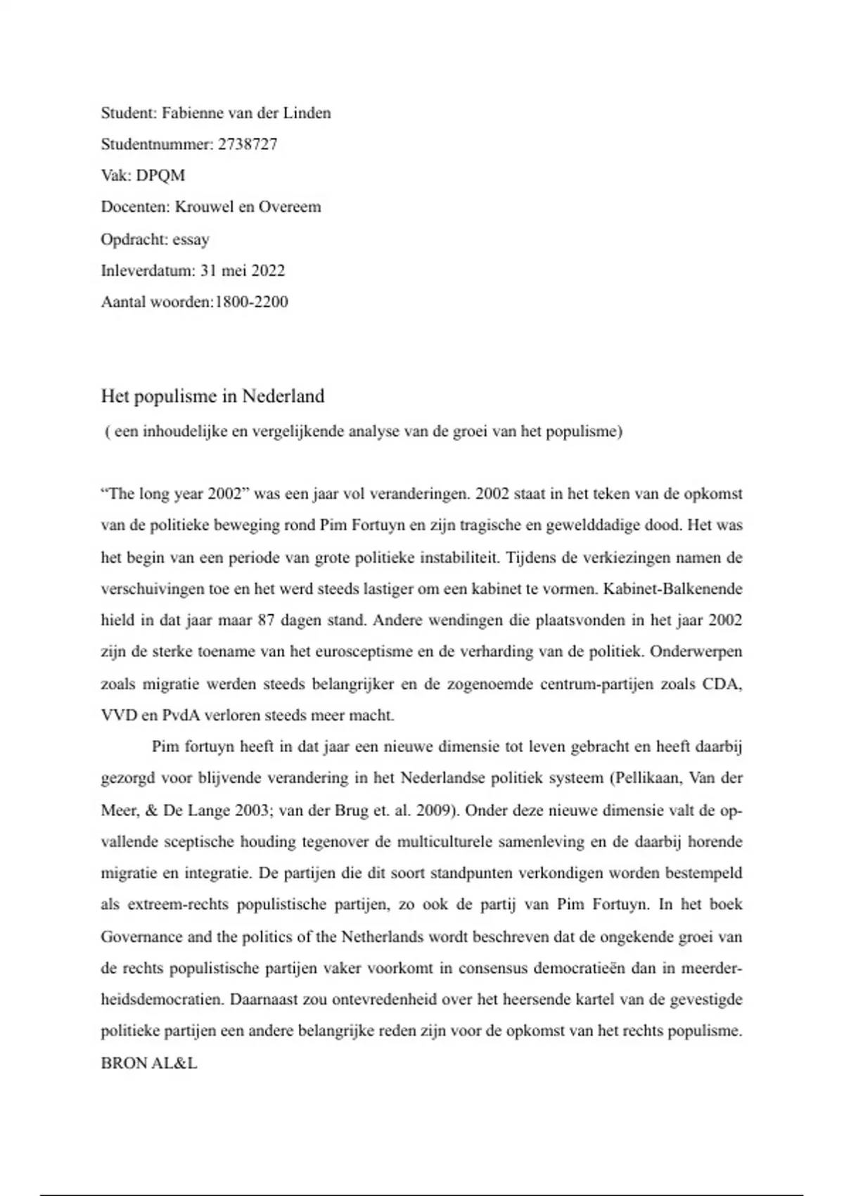 groei van het rechts populisme binnen Nederland rond het jaar 2002 en vindt deze ontwikke-