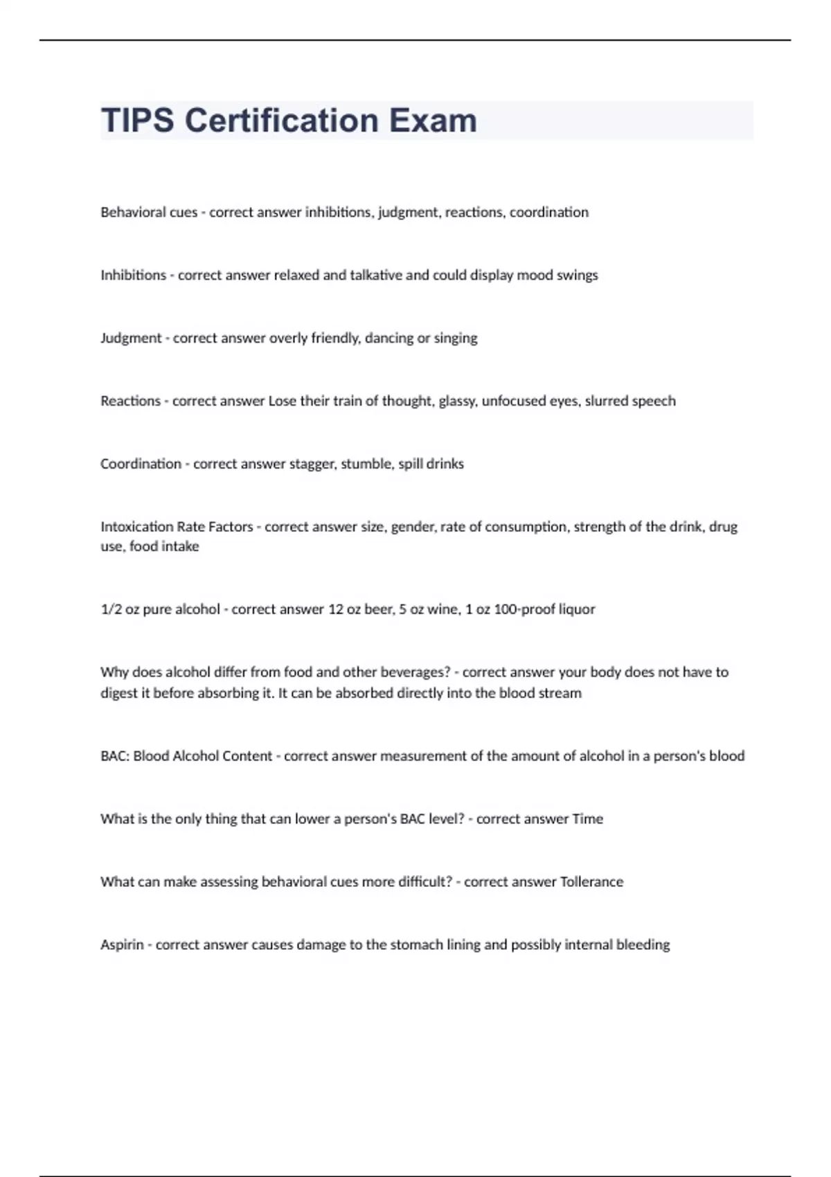 TIPS Certification Exam Question and answers already passed 2023/2024 Behavioral cues - correct answer inhibitions, judgment, reactions, coordination Inhibitions - correct answer relaxed and talkative and could display mood swings Judgment - correct answer overly friendly, dancing or singing Reactions - correct answer Lose their train of thought, glassy, unfocused eyes, slurred speech Coordination - correct answer stagger, stumble, spill drinks
