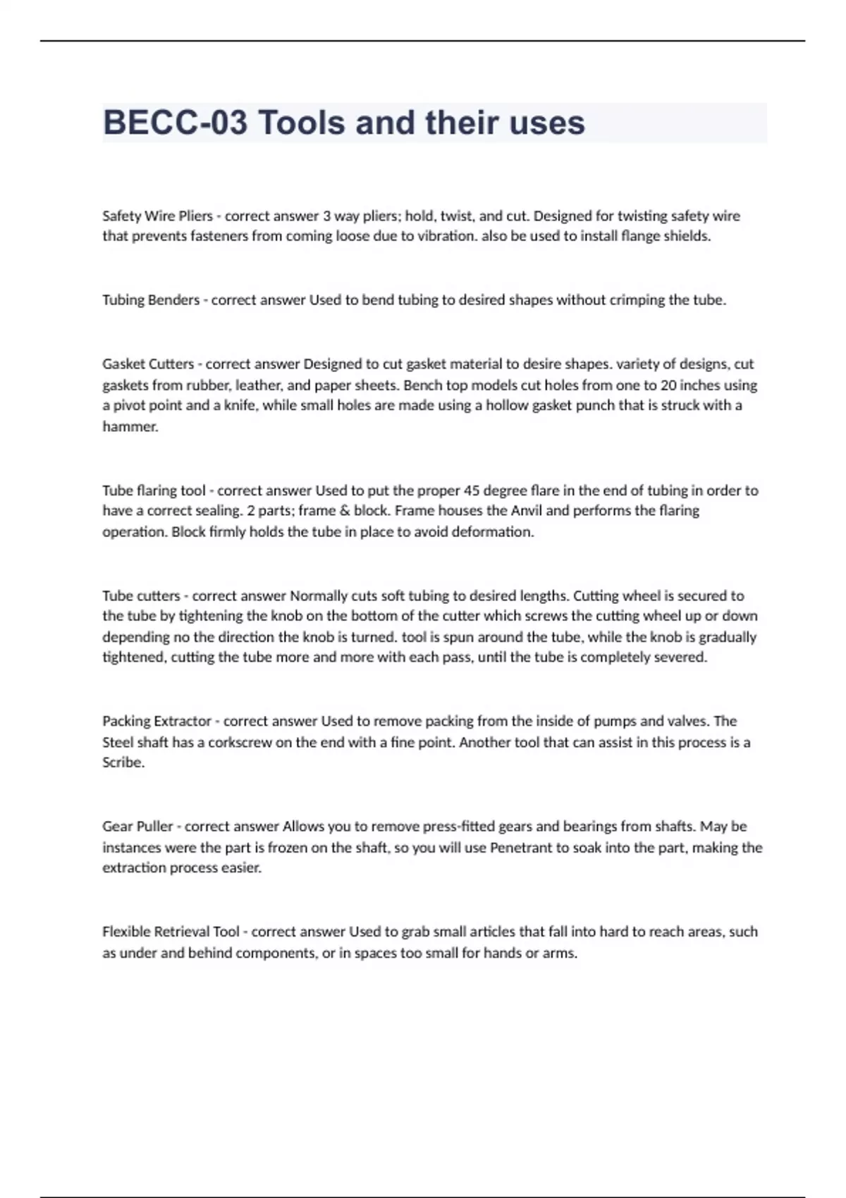 BECC-03 Tools and their uses Questions with complete solution 2023/2024Safety Wire Pliers - correct answer 3 way pliers; hold, twist, and cut. Designed for twisting safety wire that prevents fasteners from coming loose due to vibration. also be used to install flange shields. Tubing Benders - correct answer Used to bend tubing to desired shapes without crimping the tube. Gasket Cutters - correct answer Designed to cut gasket material to desire shapes. variety of designs, cut gaskets from rubber, leather, and paper sheets. Bench top models cut holes from one to 20 inches using a pivot point and a knife, while small holes are made using a hollow gasket punch that is struck with a hammer. Tube flaring tool - correct an