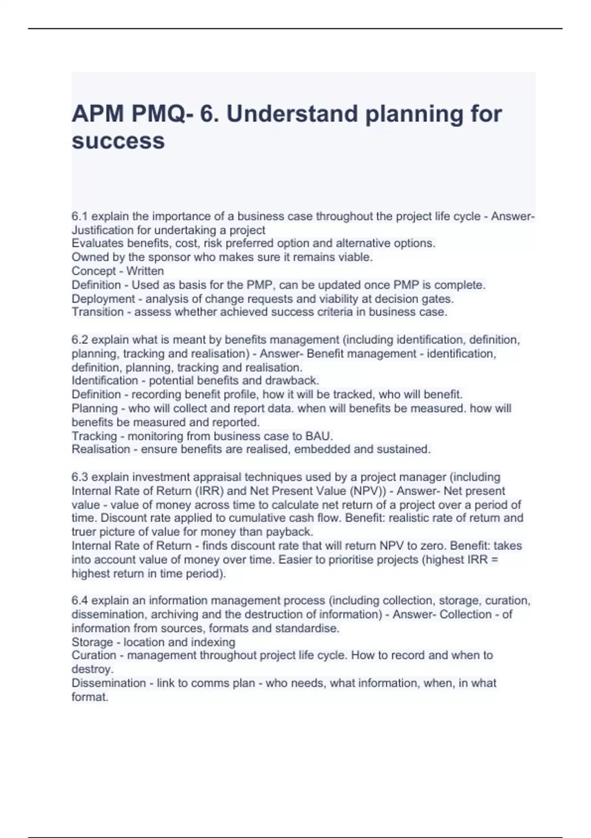 APM PMQ- 6. Understand planning for success Exam Questions and Answers