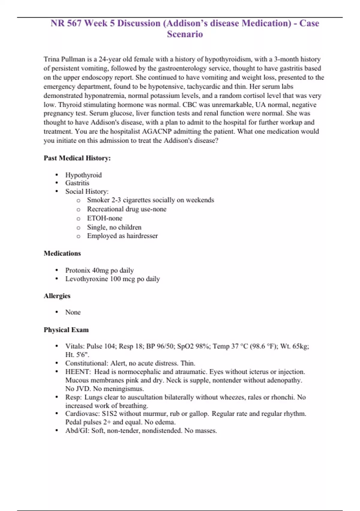 NR 567 Week 5 Discussion (Addison’s disease Medication) - Case Scenario Trina Pullman is a 24-year old female with a history of hypothyroidism, with a 3-month history of persistent vomiting, followed by the gastroenterology service, thought to have gastritis based on the upper endoscopy report.